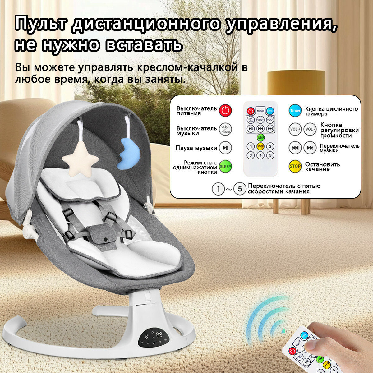 Умное детское кресло-качалка с Bluetooth, 6 мелодиями и регулируемым углом – комфорт для малыша и удобство для родителей информация: