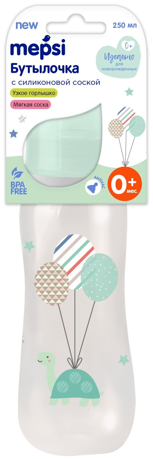 Бутылочка для кормления с силиконовой соской Mepsi, 250 мл, 0+, "Шарики. Черепаха" информация: