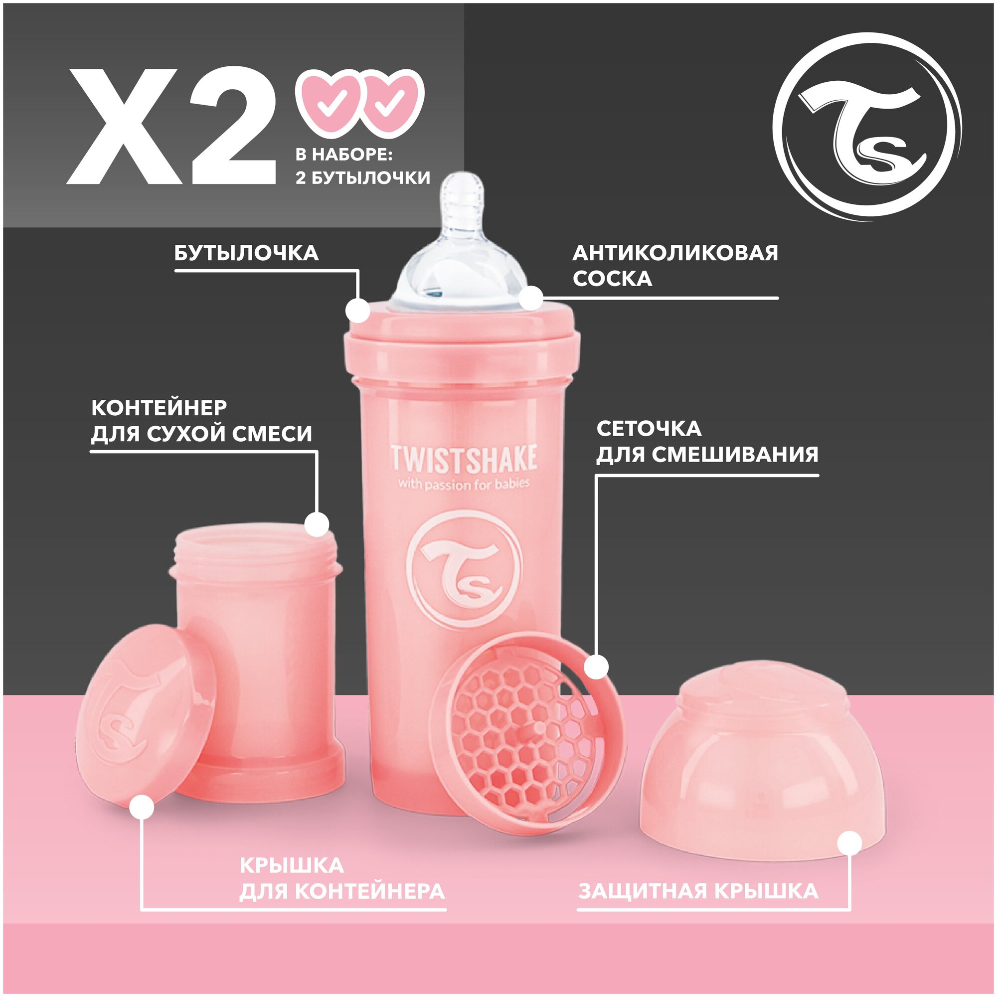 Набор антиколиковых бутылочек Twistshake. 260 мл. 2+ мес. Пастельный розовый. информация: