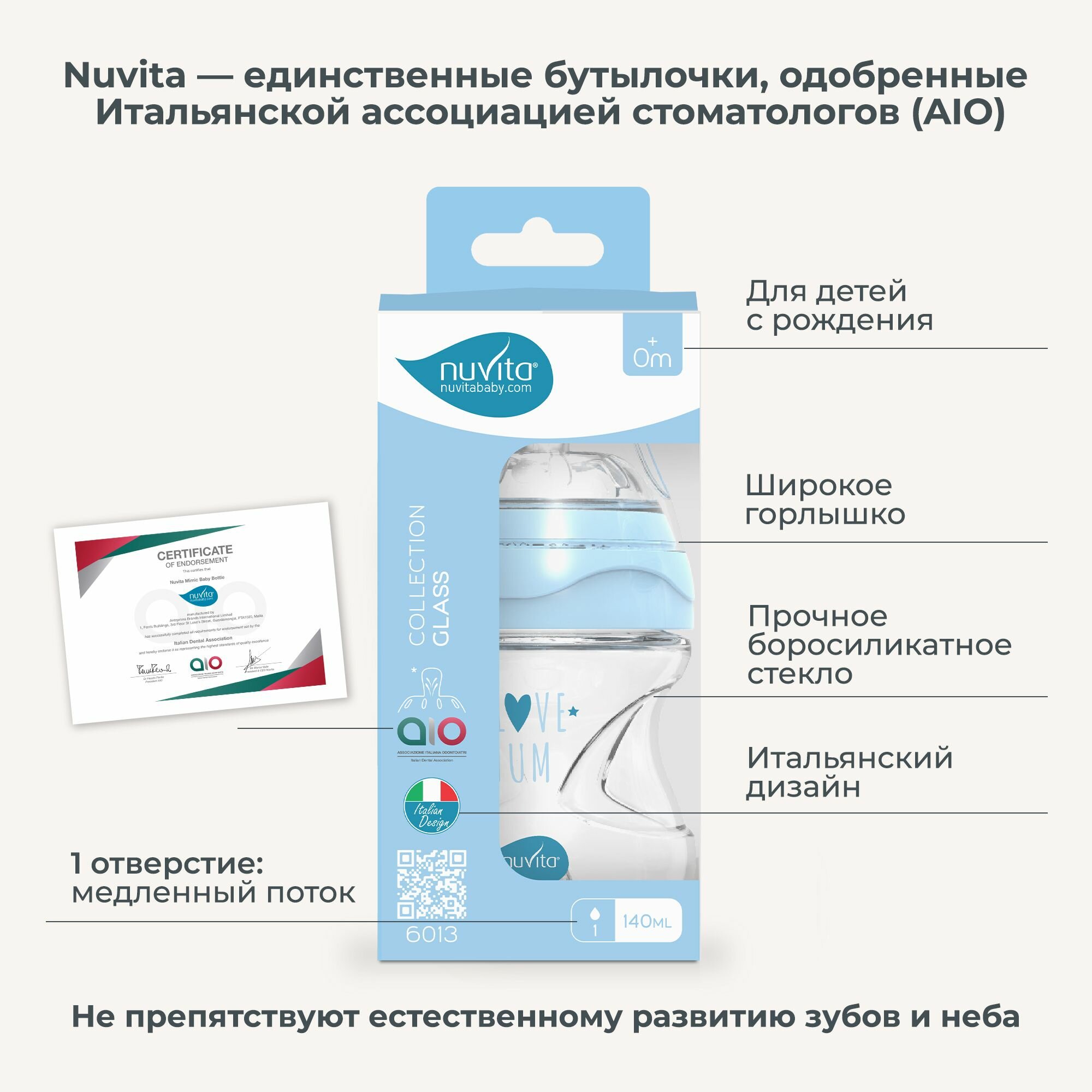 10 цен на Бутылочка антиколиковая для кормления новорожденных Nuvita Glass Collection 140 мл, стеклянная, с медленным потоком, голубой