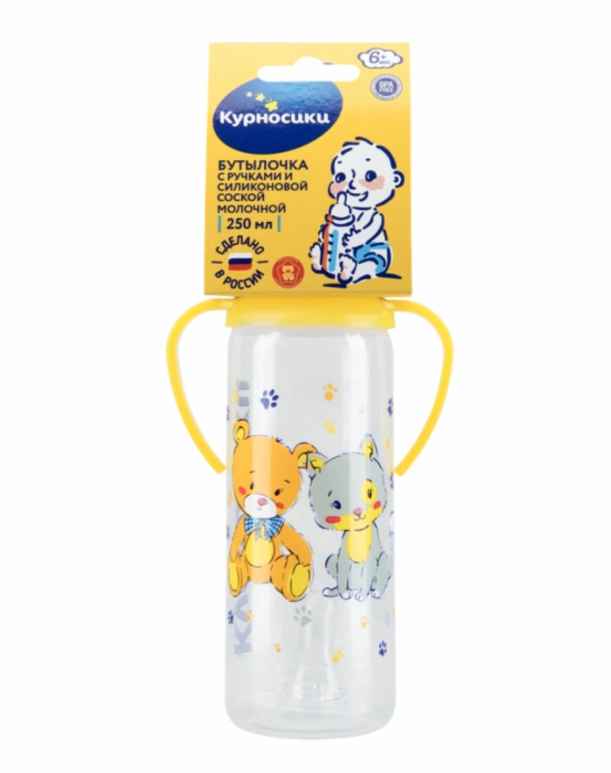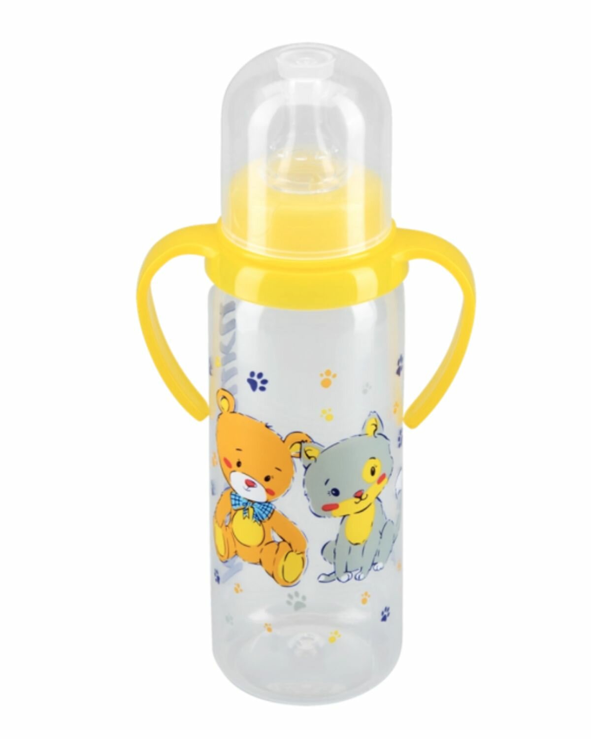 Бутылочка для кормления 250мл с ручками и силиконовой молочной соской, с рисунком, с 6 месяцев информация: