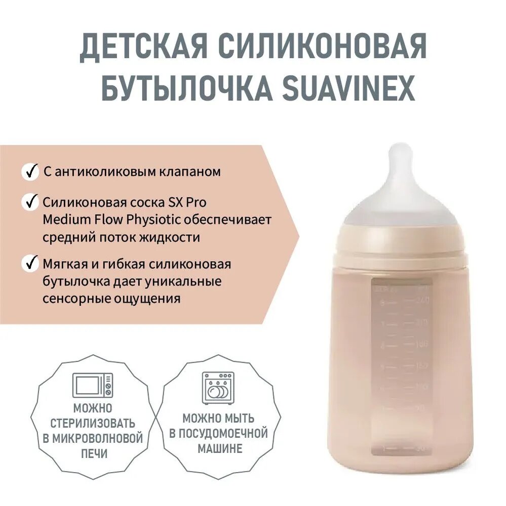 Бутылочка силиконовая Suavinex 240 мл. для детей, с соской SX Pro +3m, антиколиковый клапан (308070) А 2 790 ₽