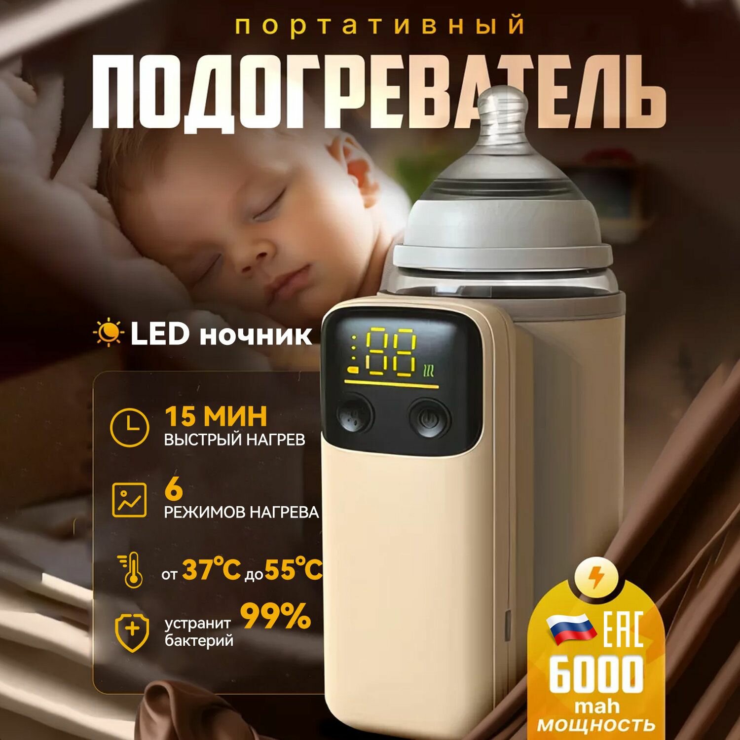 Отзывы на Портативный подогреватель для бутылочек нагреватель бутылочки,6000mAh,6 режимов нагрева, LED, от 37 до 55 градусы Цельсия