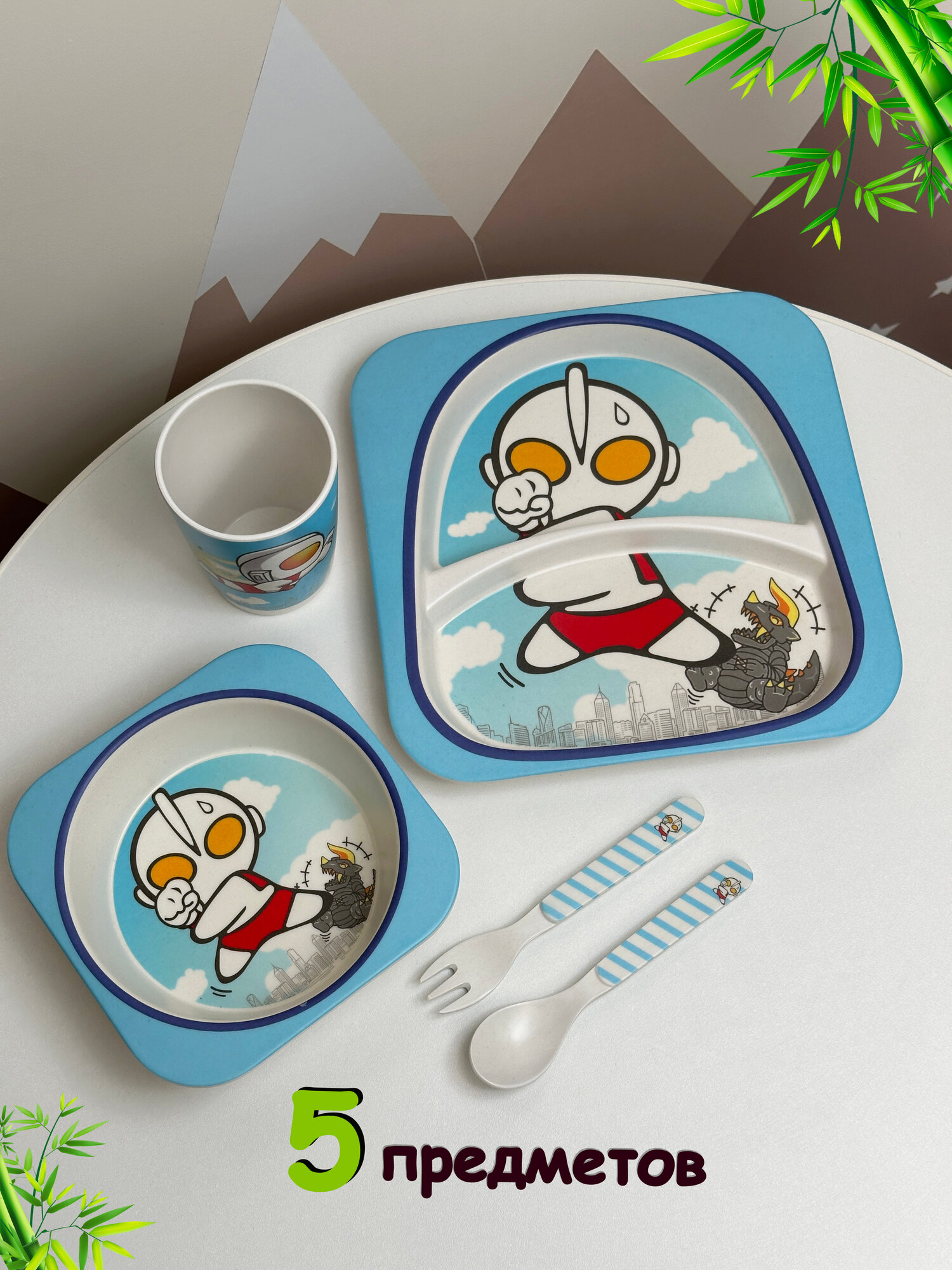 Детская посуда из бамбукового волокна, 5 предметов, Подарочный набор посуды для кормления малышей с роботом Ультрамен информация: