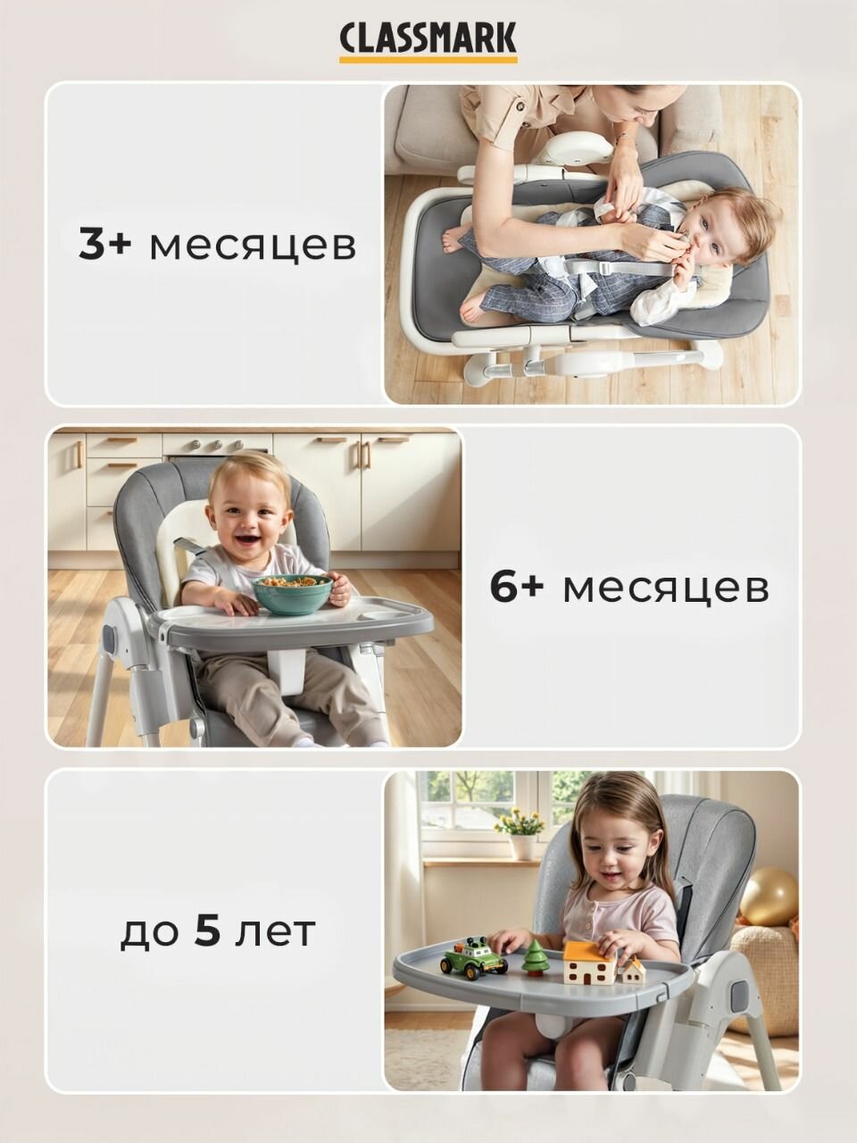 Складной стульчик для кормления ребенка Classmark 3 в 1, на колесиках, от 3 месяцев, для игр и сна информация:
