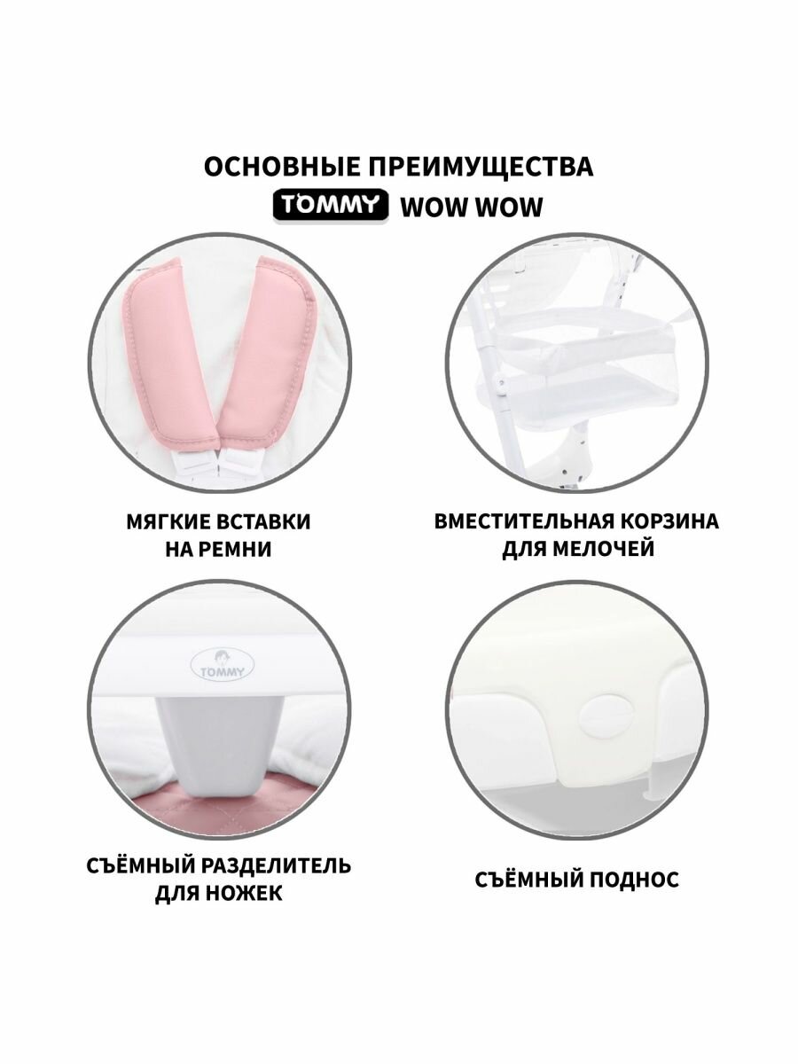 Стульчик для кормления Tommy Wow Wow розовый, складной, моющийся, на колесах информация: