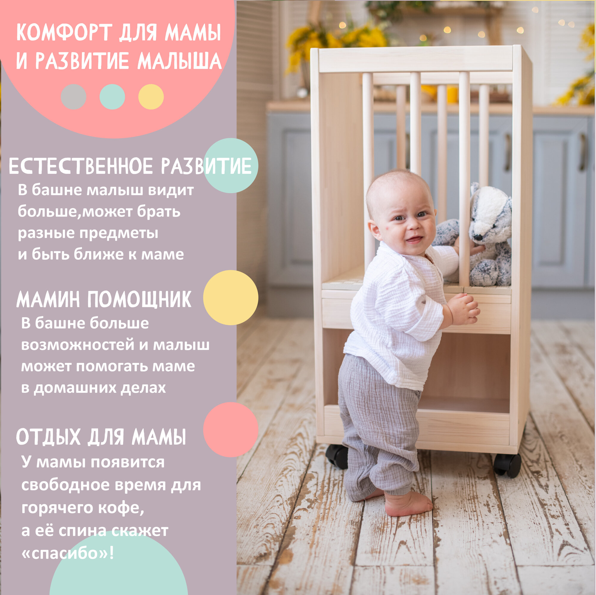 Башня Помощника Mr. Кнопкинс Монтессори 43 см x 40 см x 92 см, с ковриком, ручная работа 10 350 ₽