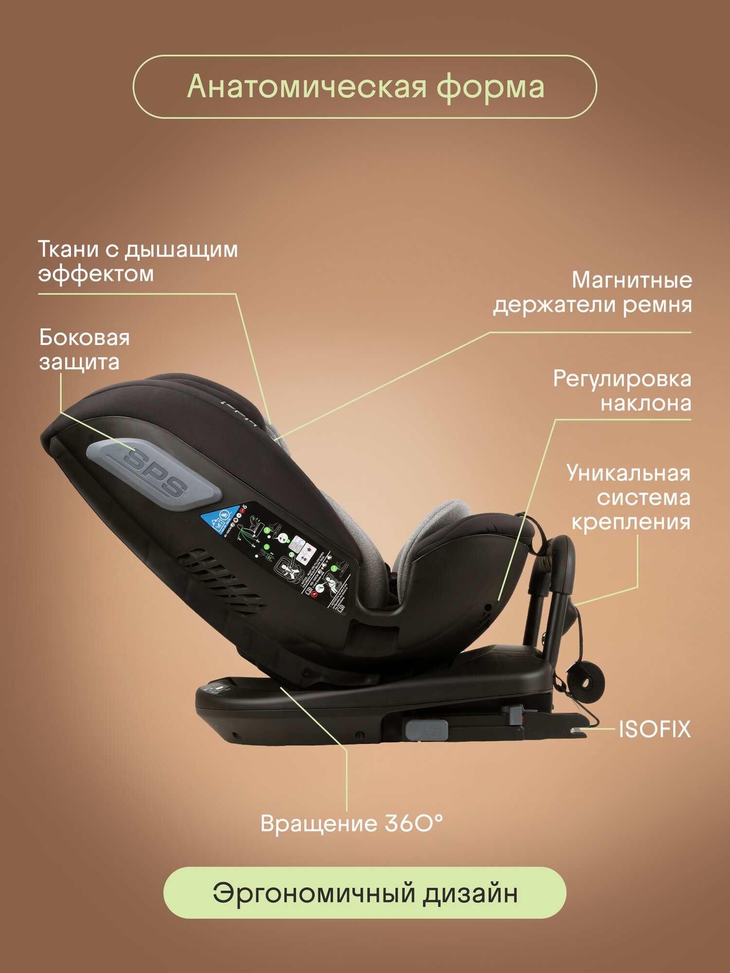 Автокресло детское Kidzi SPIN PLUS 360 i-SIZE для новорожденных и детей ростом 40-150 см, c ISOFIX и якорным ремнем, черно-серый информация: