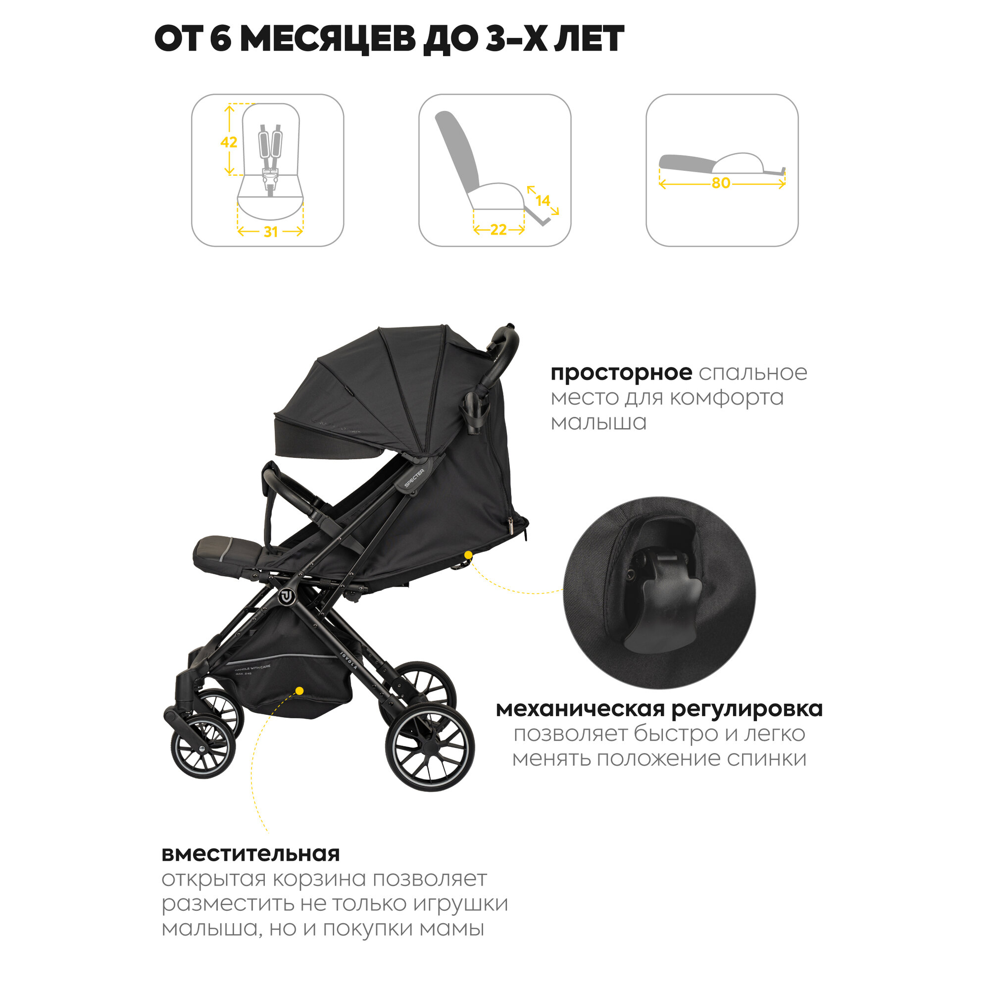 Коляска прогулочная детская Jovola Specter легкая, для путешествий, с ручкой для транспортировки, черный информация: