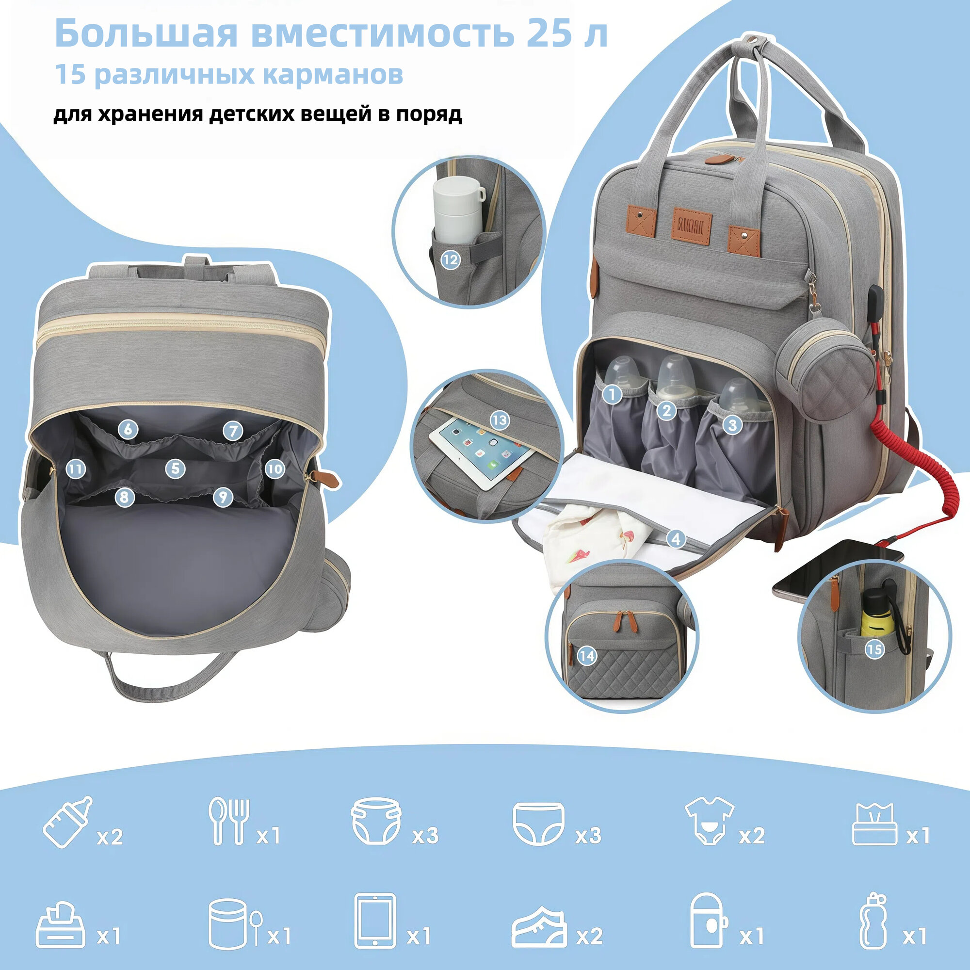 Рюкзак-сумка, с изолированным карманом, для молодой мамы, с USB-портом(серый) информация: