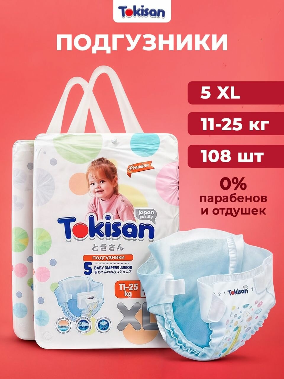 Подгузники трусики Tokisan 108 шт, японское качество, 5 размер XL, 11-25 кг, детские, дневные и ночные информация:
