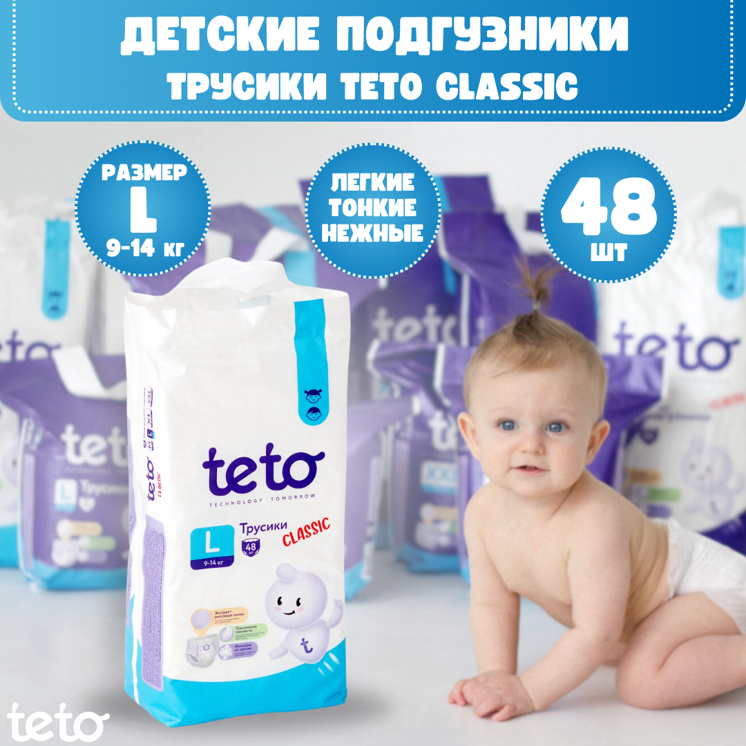 Teto Подгузники-трусики детские Classic для мальчиков и для девочек, размер 4 L (9-14 кг), упаковка 48 шт. информация: