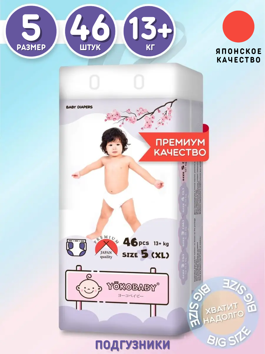Подгузники Детские Yokobaby Baby Diaper XL, размер 5, 13 кг+, 46шт информация: