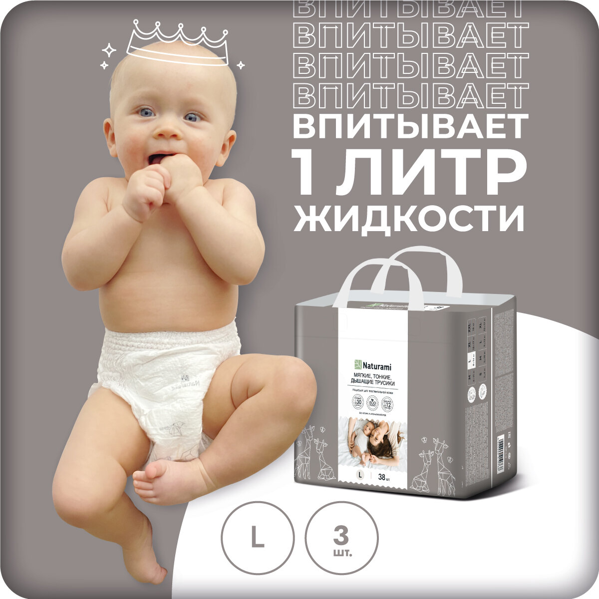 Подгузники-трусики Naturami детские для новорожденных малышей L (9-14 кг), 4 размер, 3 шт информация: