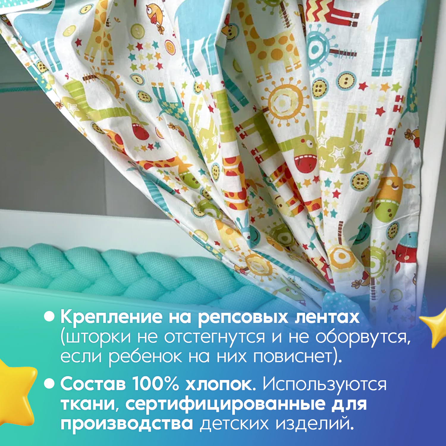 Балдахин с крышей и шторками на детскую кроватку домик 70х140 см, поплин, 100% хлопок, цвет бирюзовый с жирафиками информация: