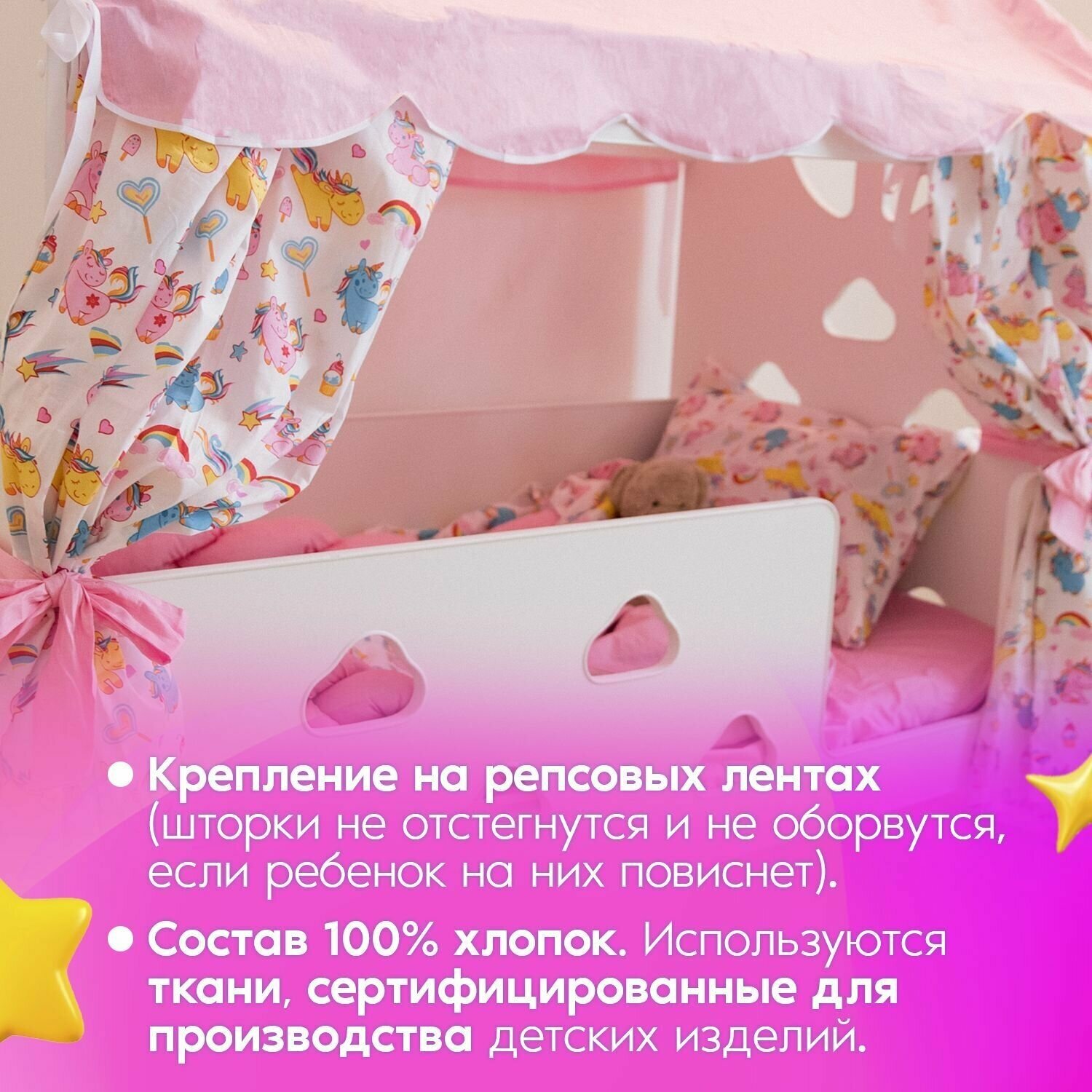 10 цен на Крыша и шторки на кровать домик 80х160 см. Балдахин на кровать домик со шторками, 100% хлопок, поплин, цвет розовый с единорогами