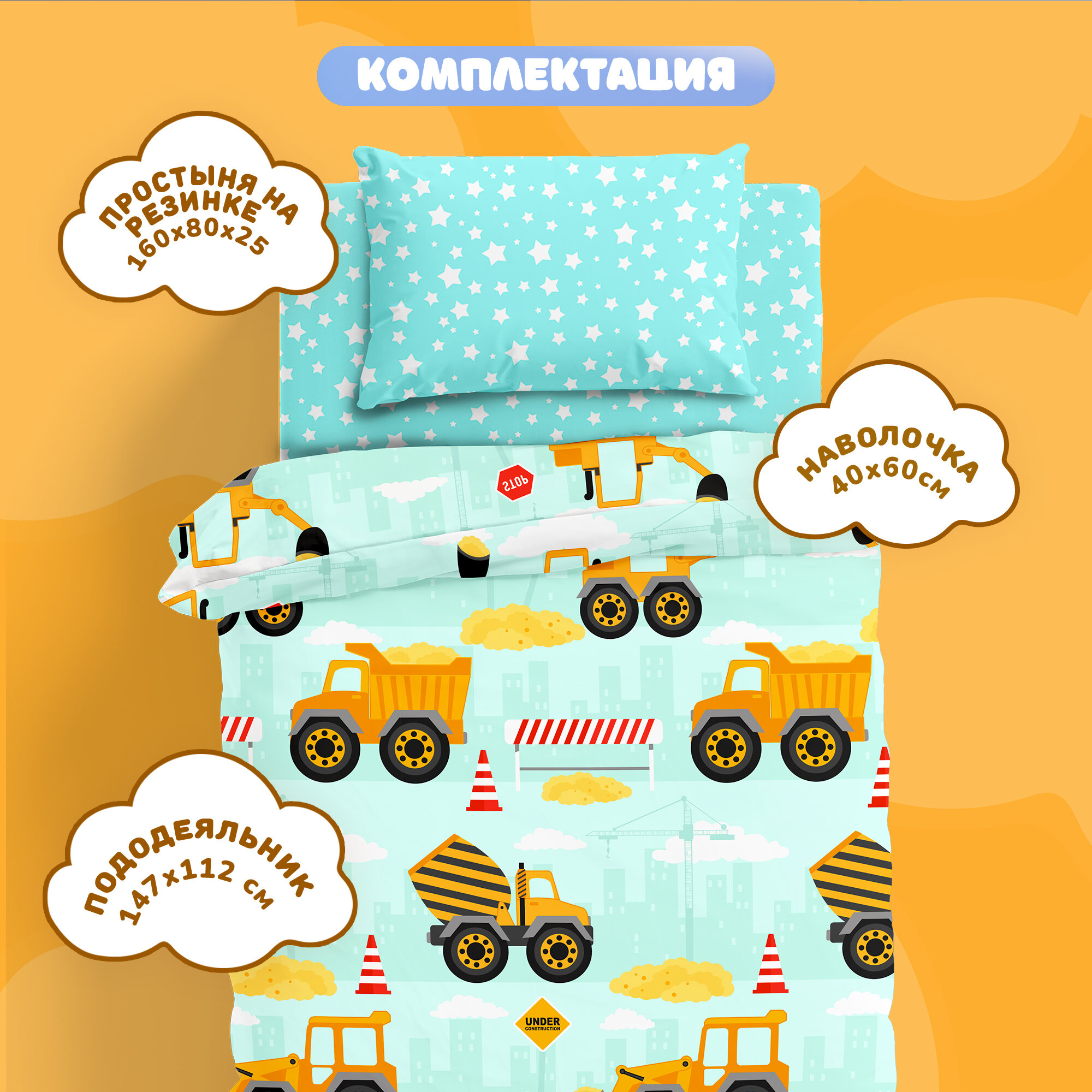Детское постельное белье в кроватку Juno, Поплин, на резинке 160х80 см, нав. 40х60, Строительный транспорт информация: