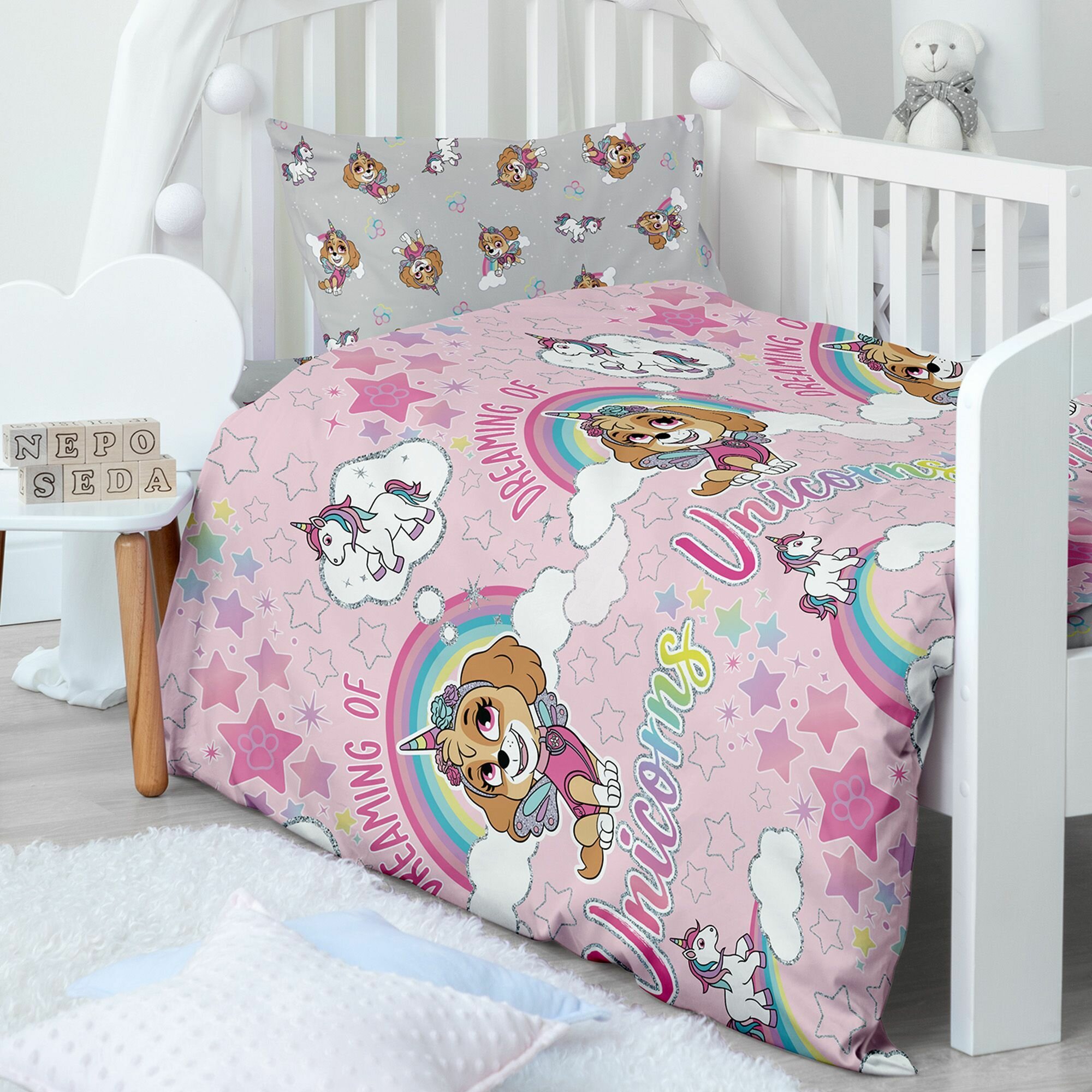 10 цен на Детское постельное белье в кроватку Непоседа, Поплин, для матрасов 160х80 см, нав. 40х60, Единорожка Скай