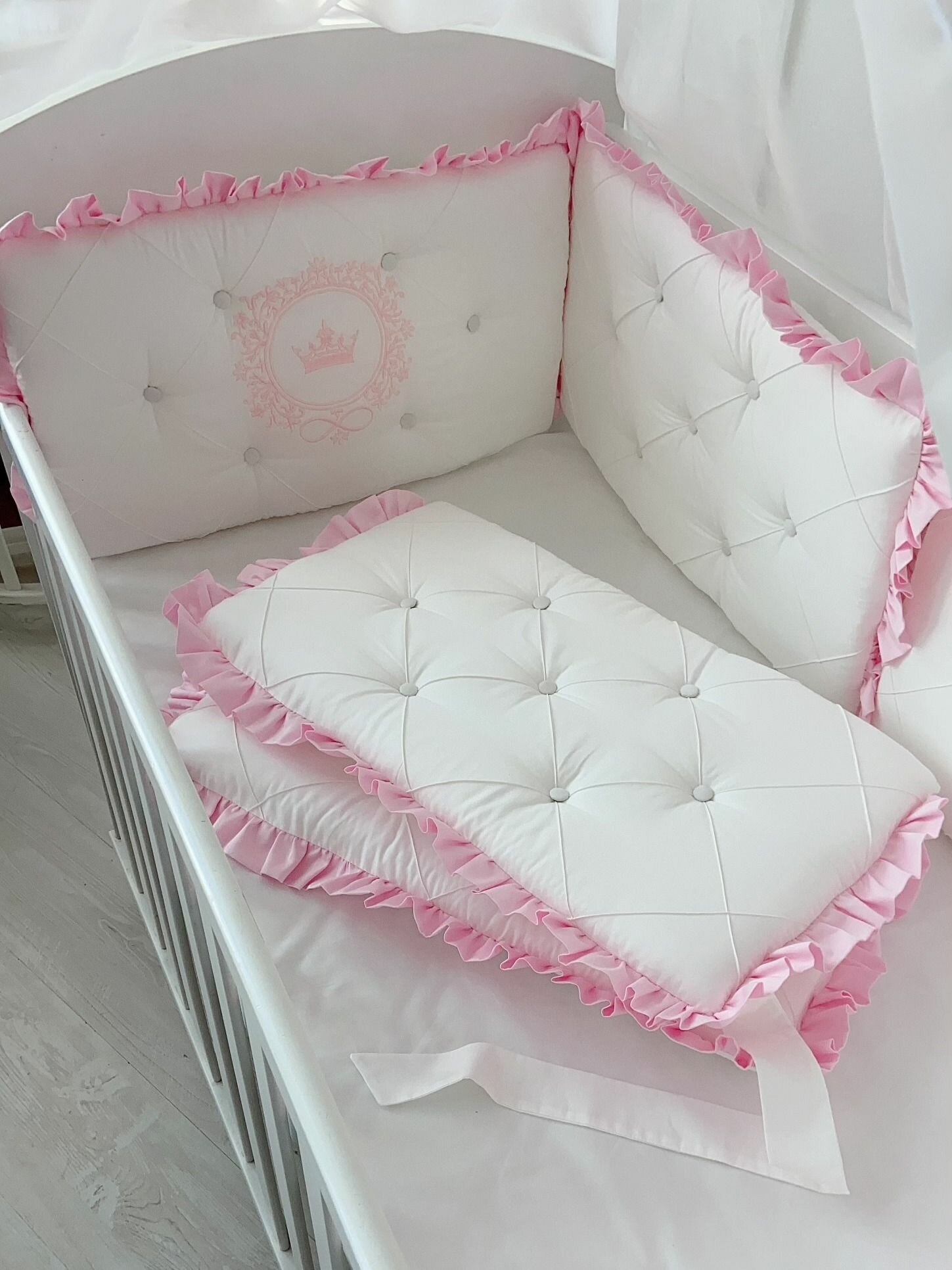 Бортики в кроватку для новорожденных + простыня, "Утонченность", пудровый, сатин, в кроватку для новорожденных 120*60 см или овальной 125*75 см, KrisFi 12 000 ₽
