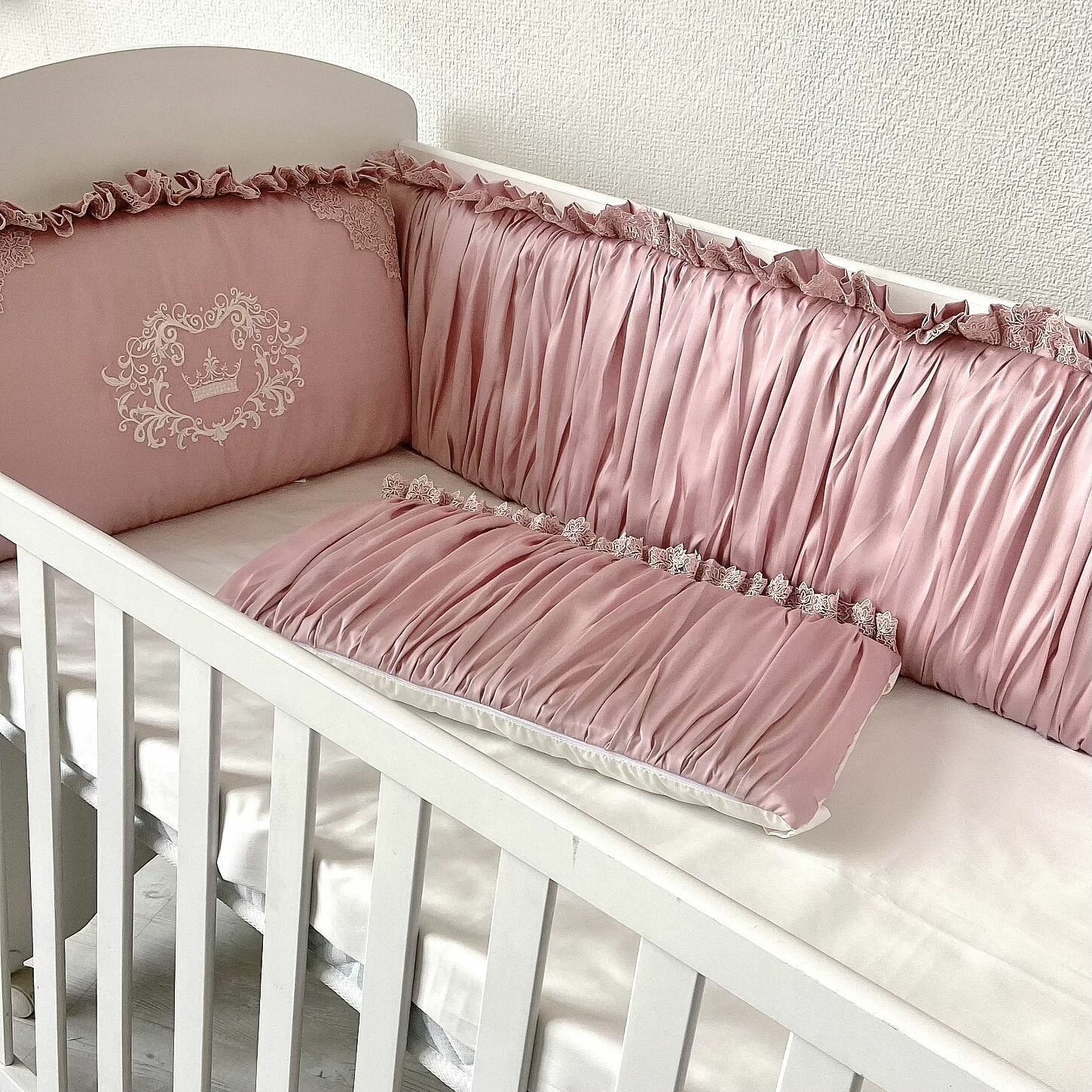Отзывы на Бортики в кроватку для новорожденных + простыня, "Утонченность", пудровый, сатин, в кроватку для новорожденных 120*60 см или овальной 125*75 см, KrisFi