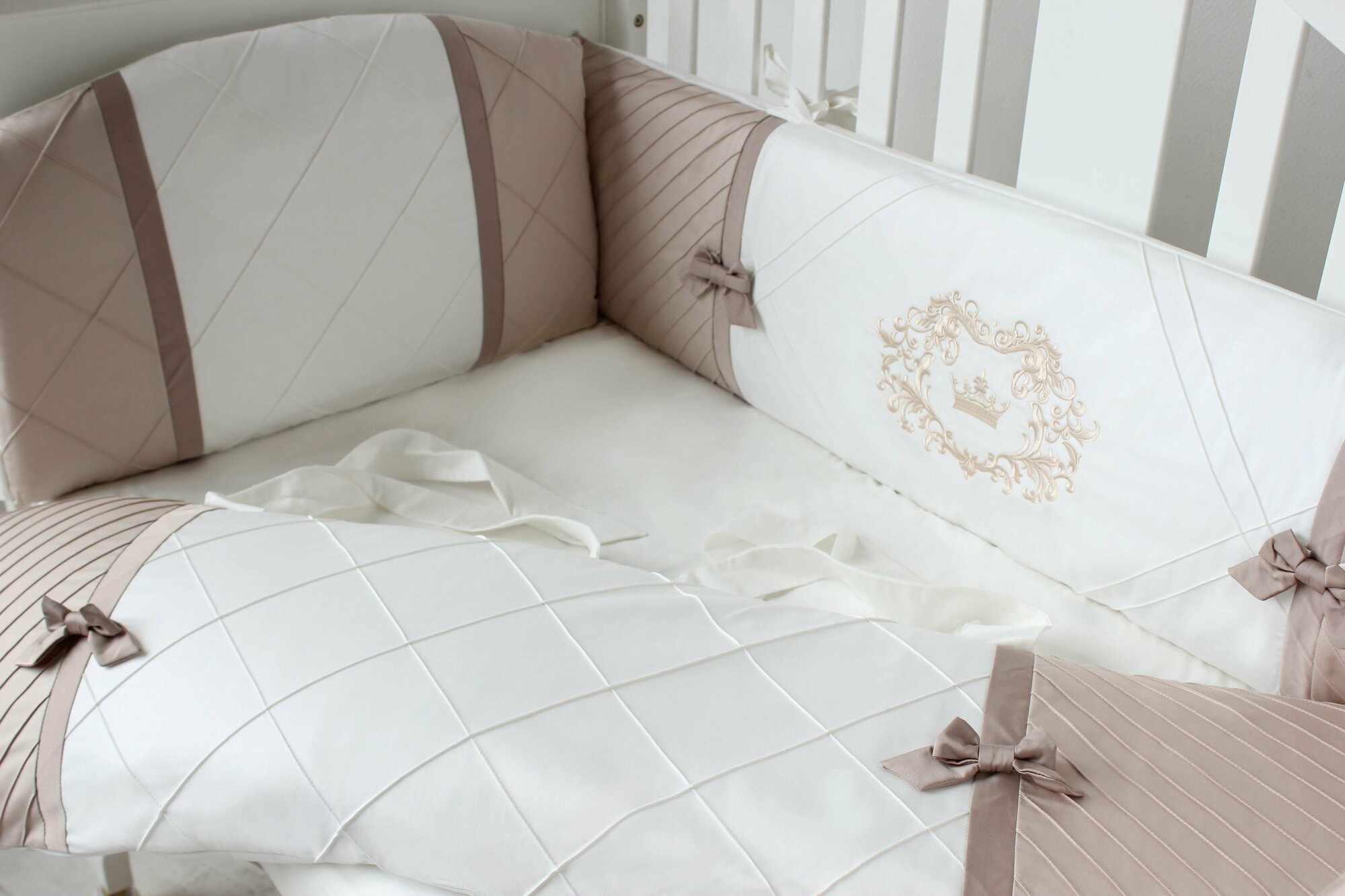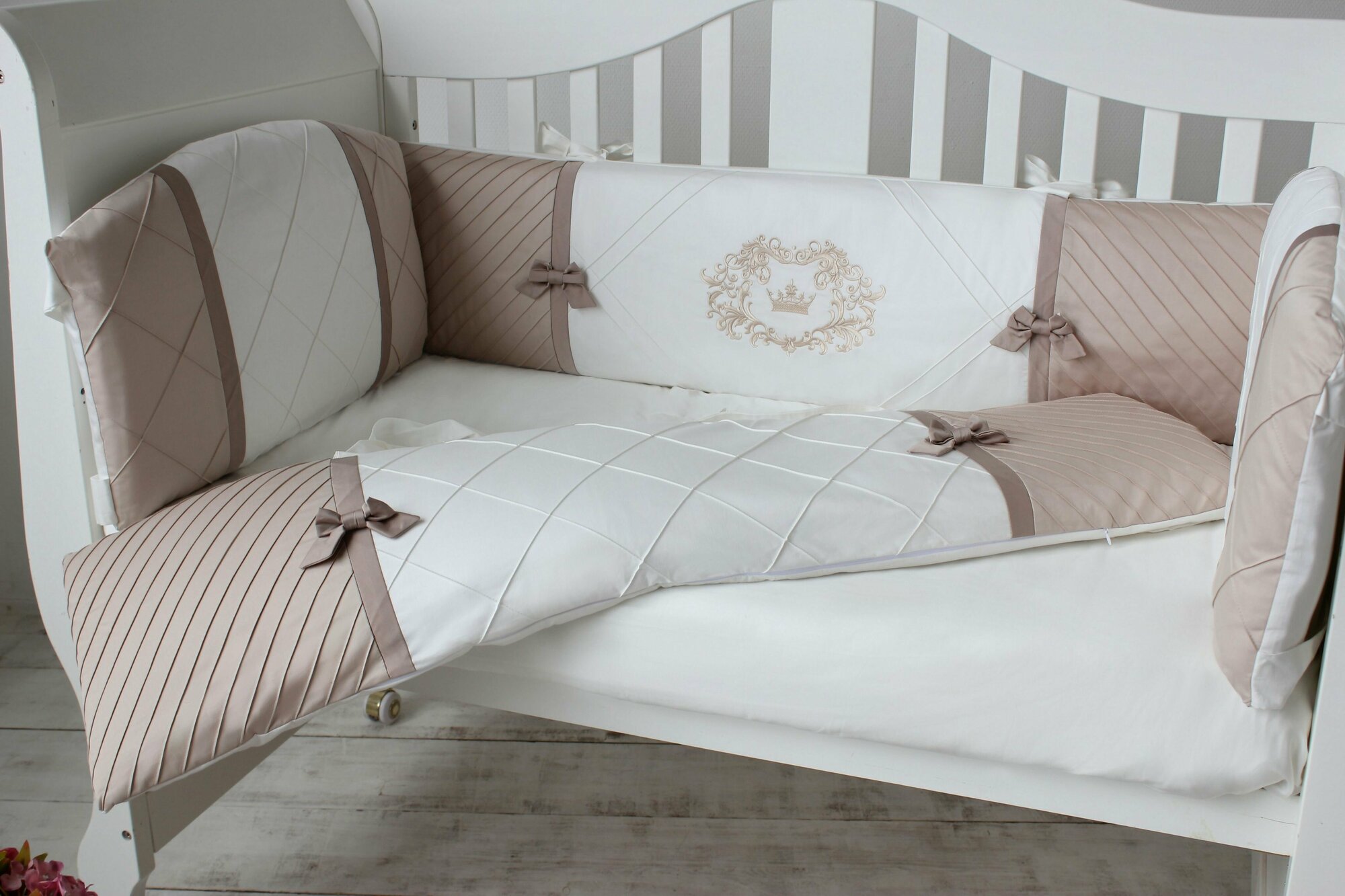 Бортики в кроватку для новорожденных + простыня "Утонченность", с бежевыми рюшами, в кроватку для новорожденных 120*60 см или овальной 125*75 см, сатин и тенсель, KrisFi 12 000 ₽