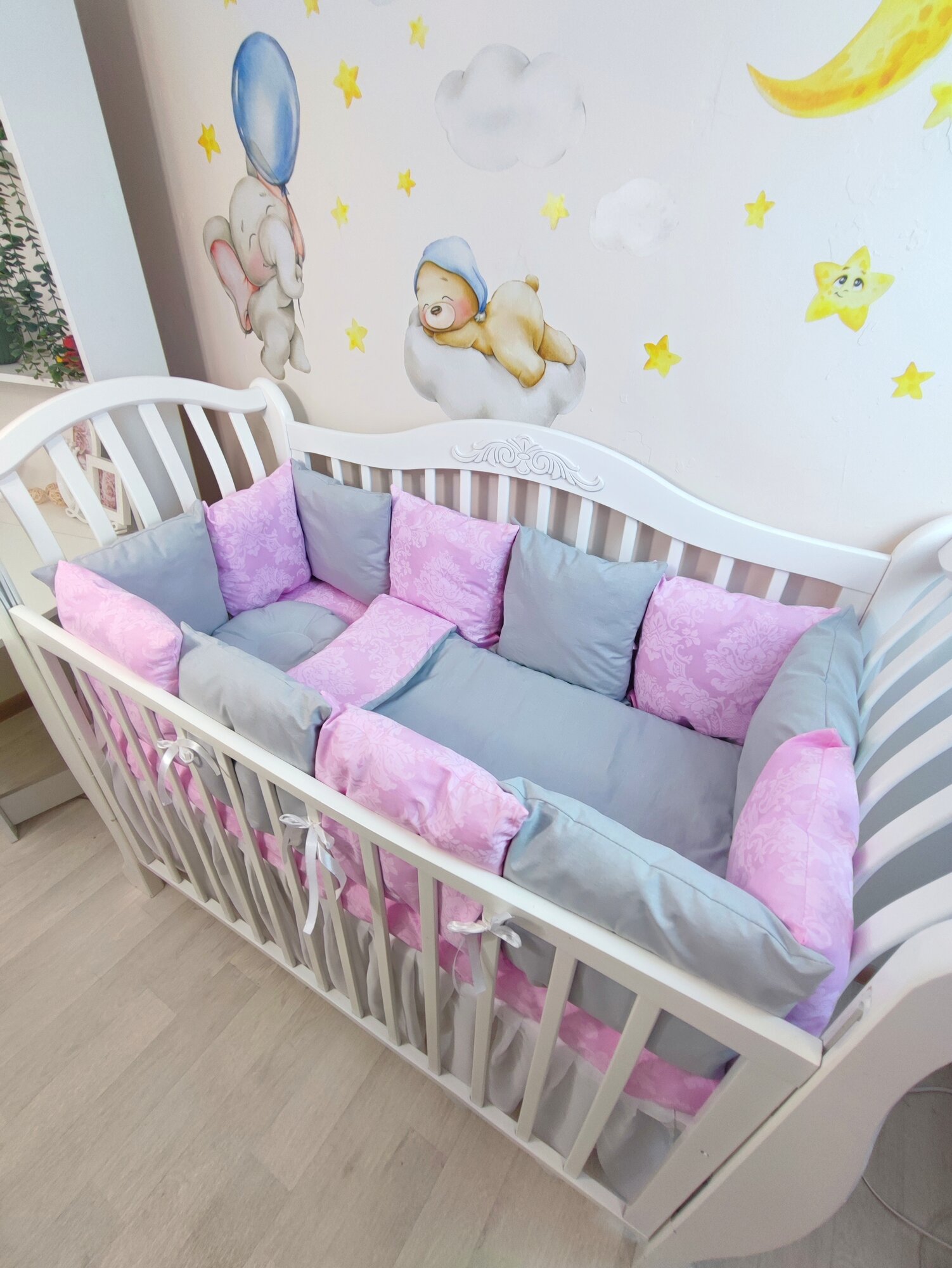 Комплект бортиков в кроватку из 15 предметов Mamdis для новорожденных и малышей розово-серый информация: