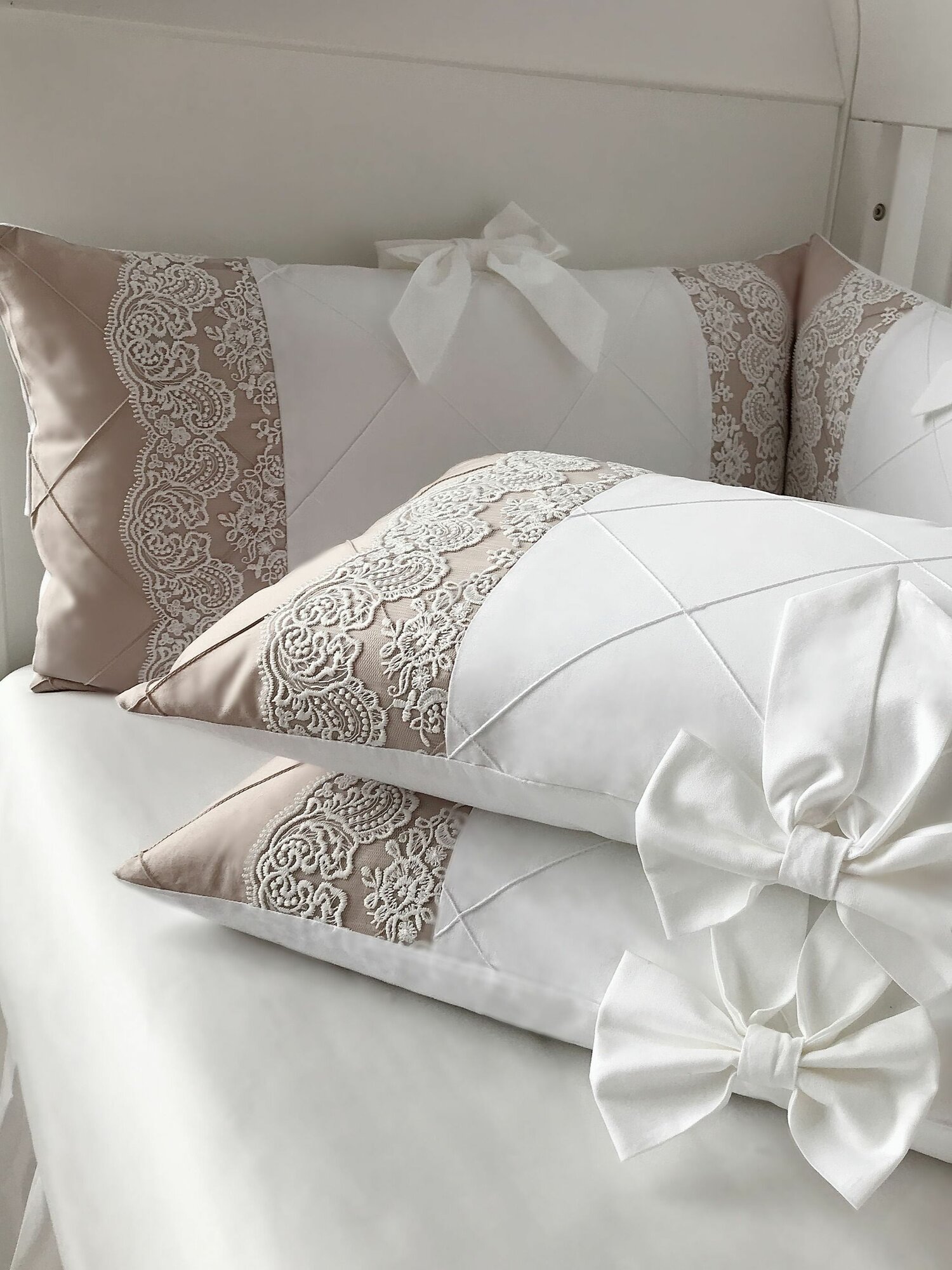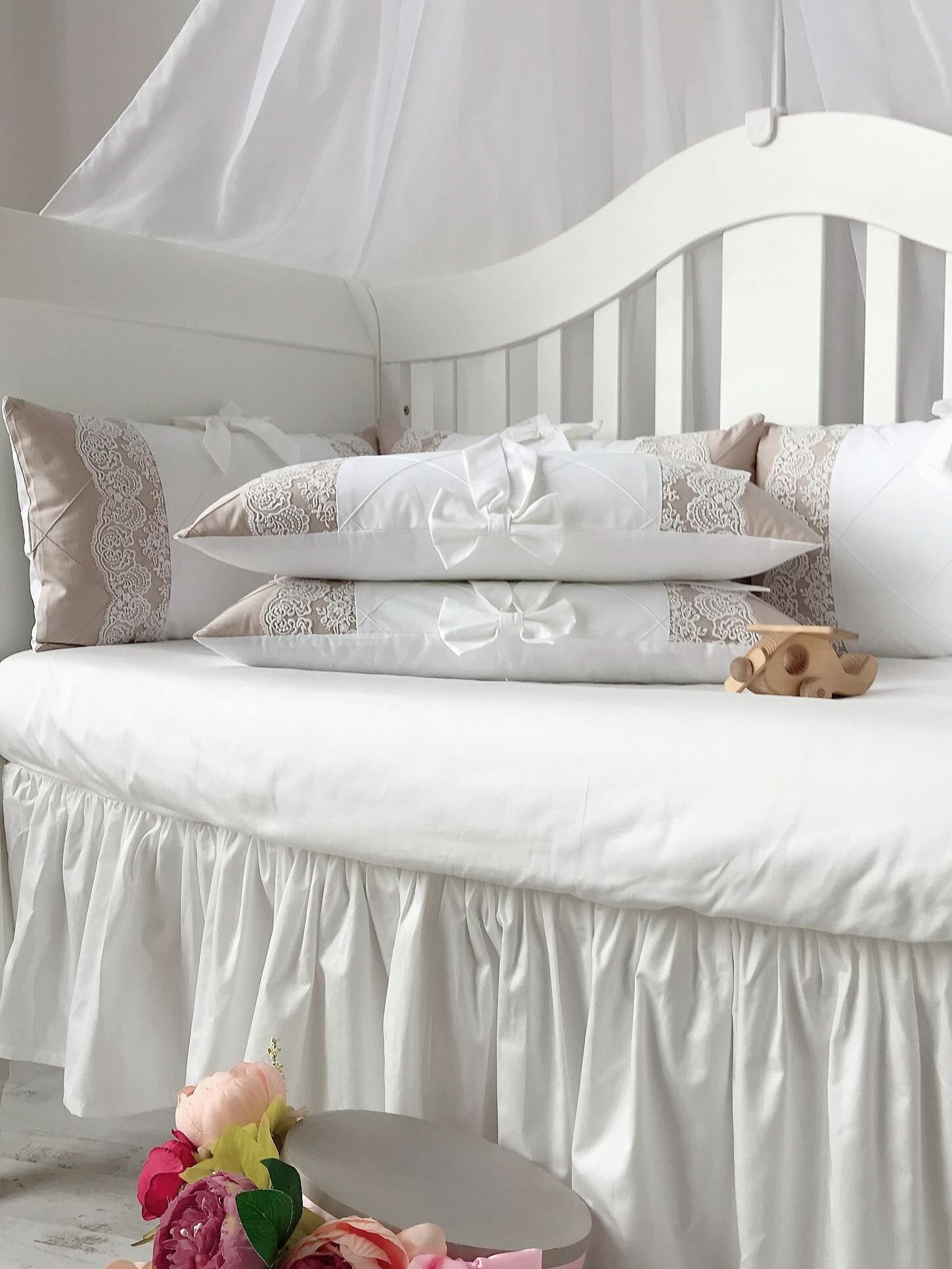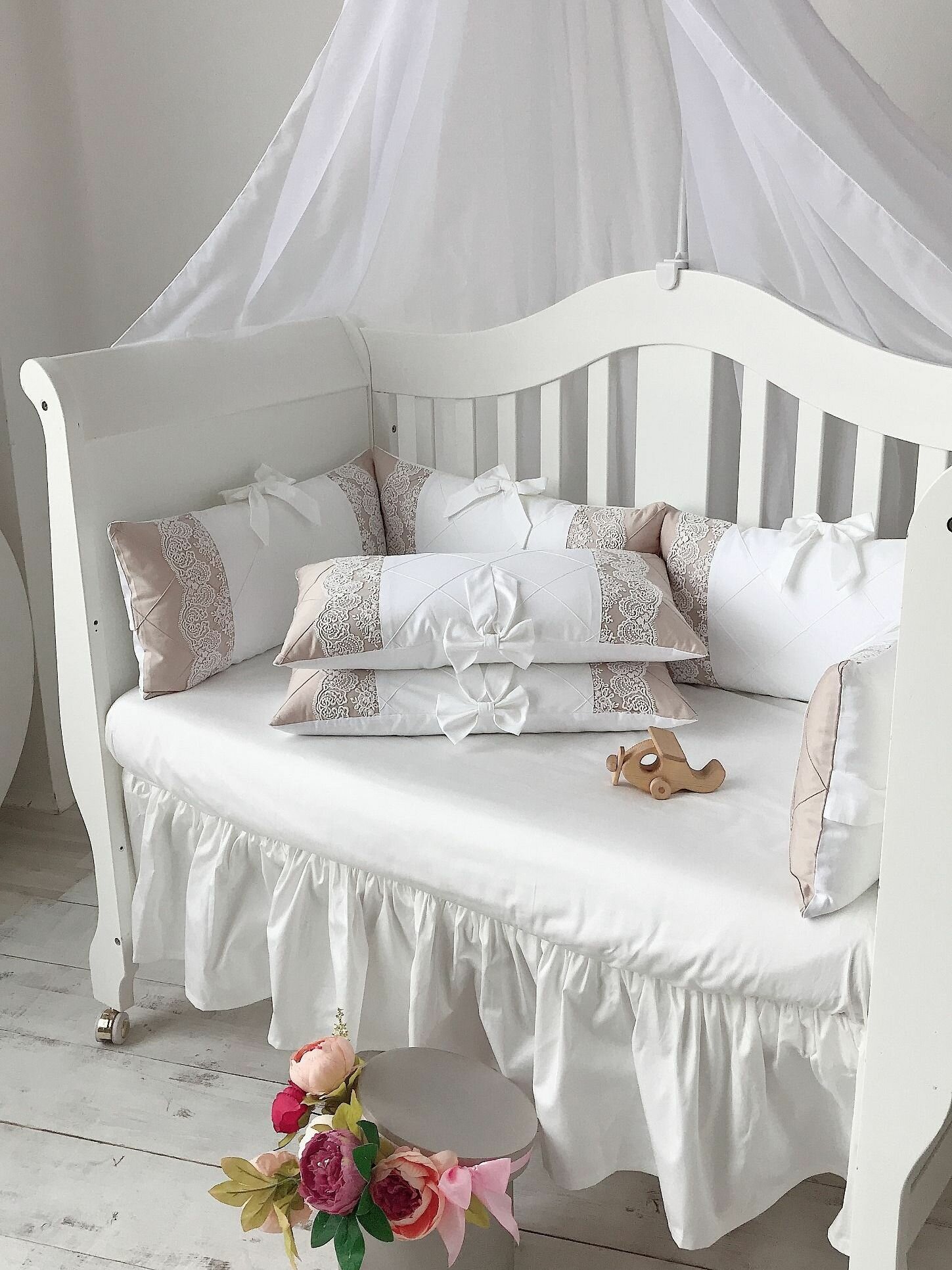 Бортики в кроватку для новорожденных "Роскошь" с большим количеством кружева, в кроватку 120*60 см или в овальную 125*75 см, сатин 12 103 ₽
