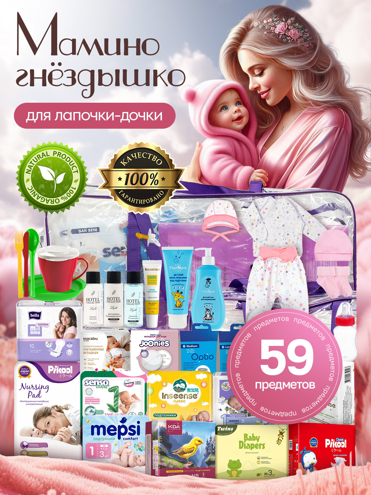 Готовая сумка в роддом для девочки "Мамино гнездышко", 59 предметов, фиолетовая информация: