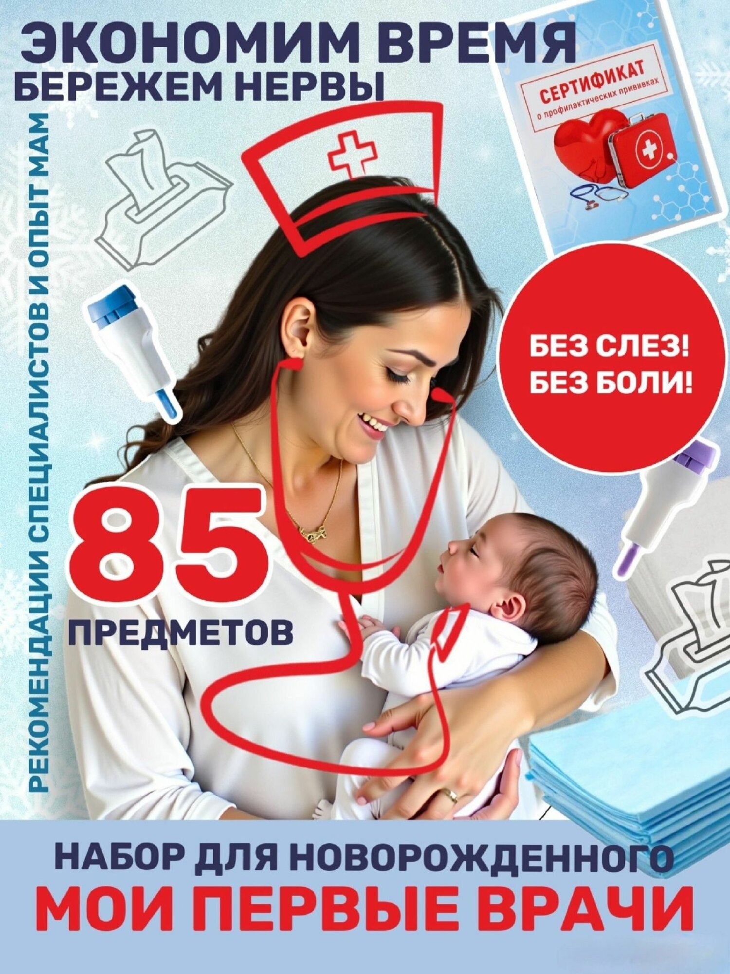 Набор для новорожденного в поликлинику для сбора анализов+сертификат о прививках, комплект 85 предметов информация: