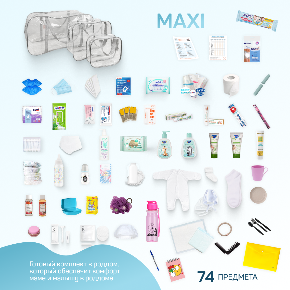 Сумка в роддом готовая для мамы и малыша, комплектация Lana Maxi, 74 предмета, прозрачная информация: