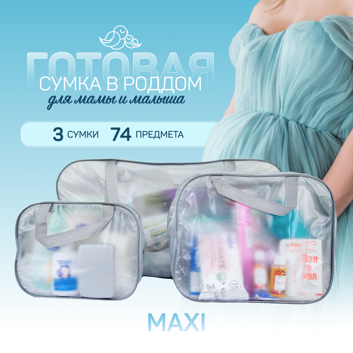 Сумка в роддом готовая для мамы и малыша, комплектация Lana Maxi, 74 предмета, прозрачная 12 063 ₽
