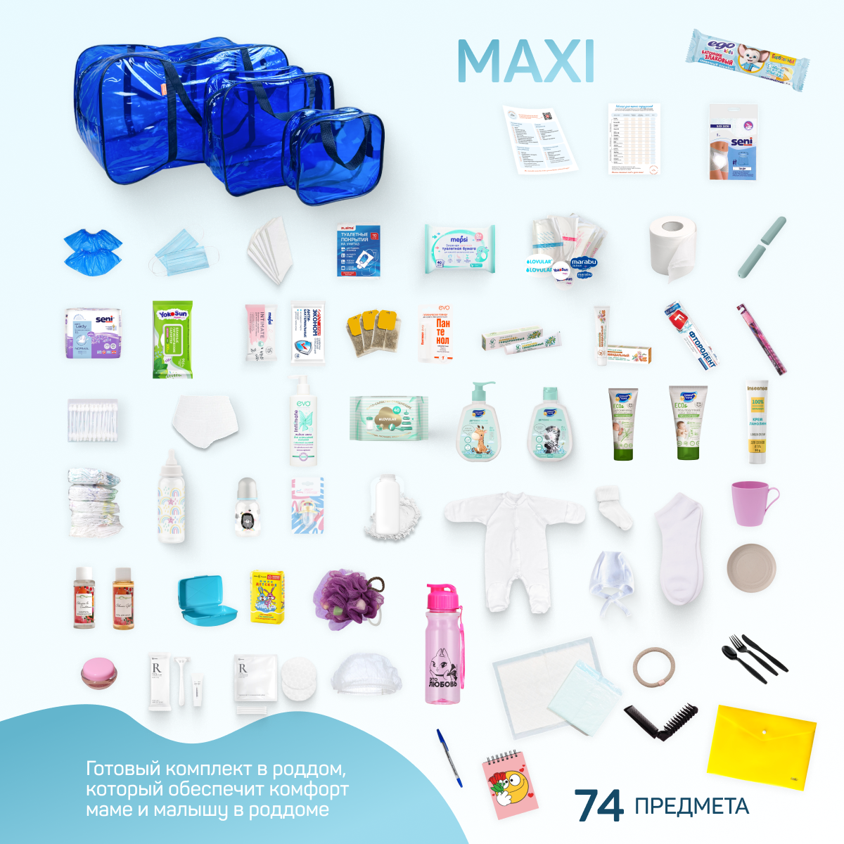 Сумка в роддом готовая для мамы и малыша, комплектация Lana Maxi, 74 предмета, синяя информация: