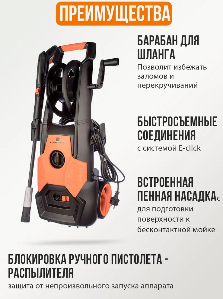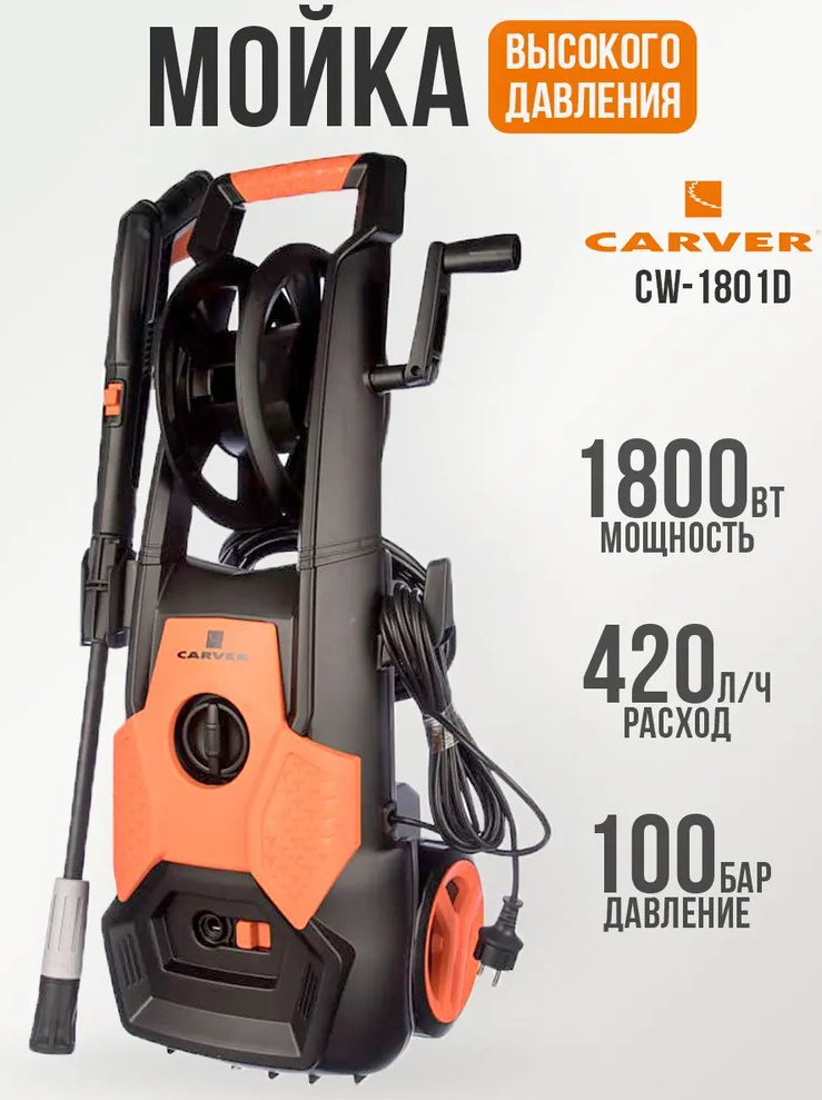 10 цен на Мойка CARVER CW-1801D (1800Вт,100-130бар,6-7л/мин, алюм, шланг 5м, самовсас, колеса, катушка) 7.7кг