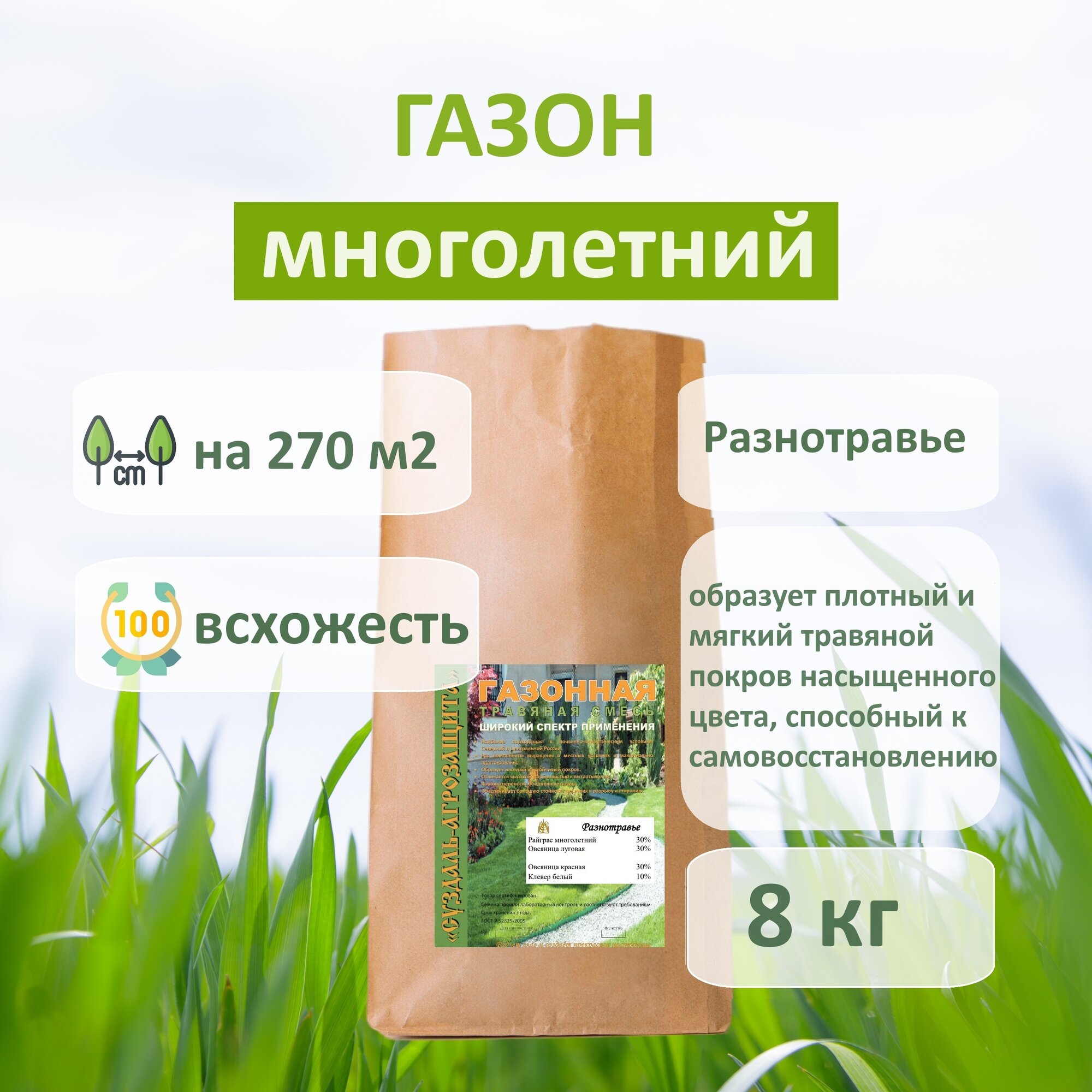 Многолетняя газонная трава с белым клевером "Разнотравье" 8 кг информация: