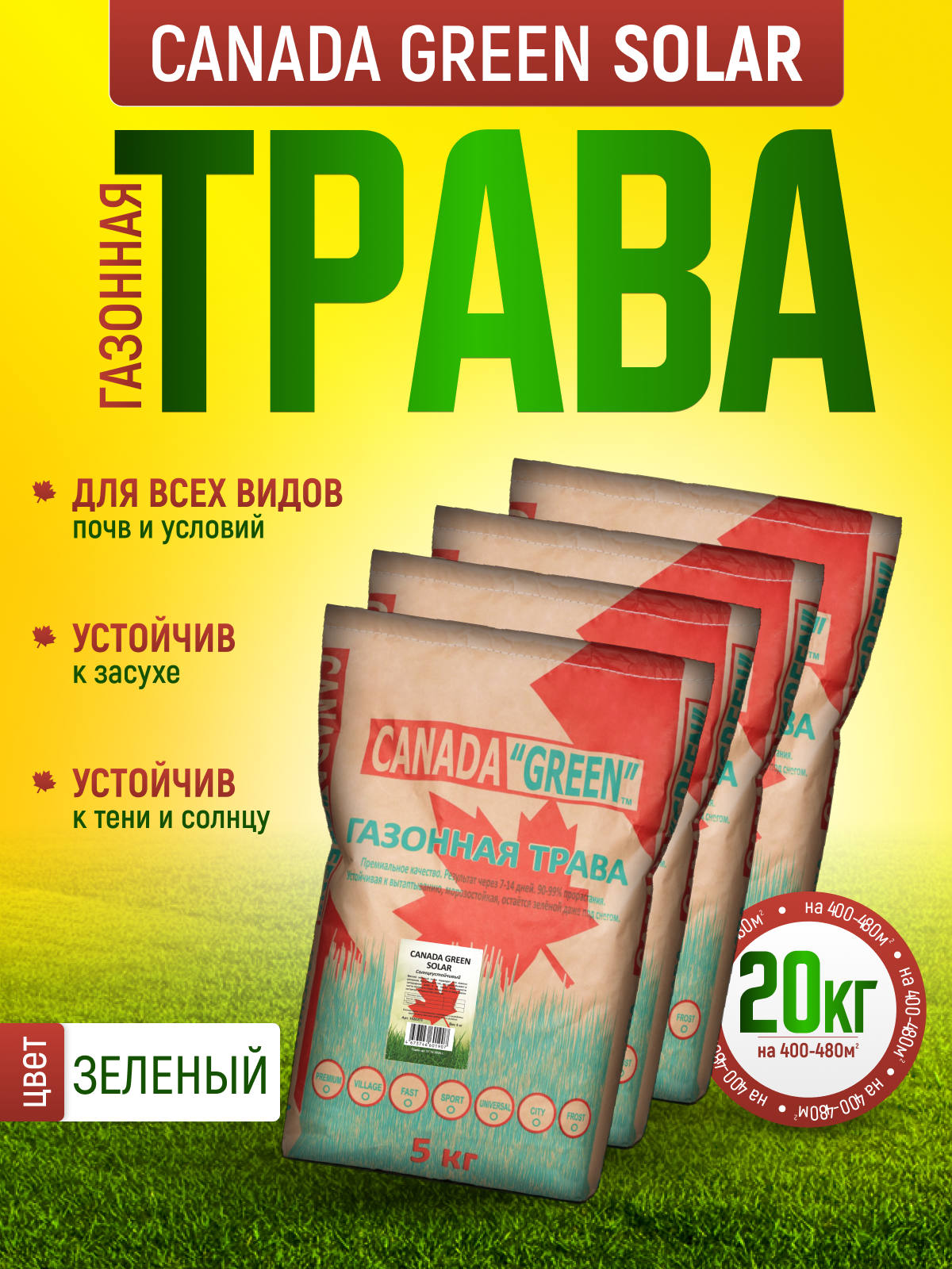 Газонная трава семена Канада Грин Солнцеустойчивая 20 кг / Canada Green Solar 20 кг информация: