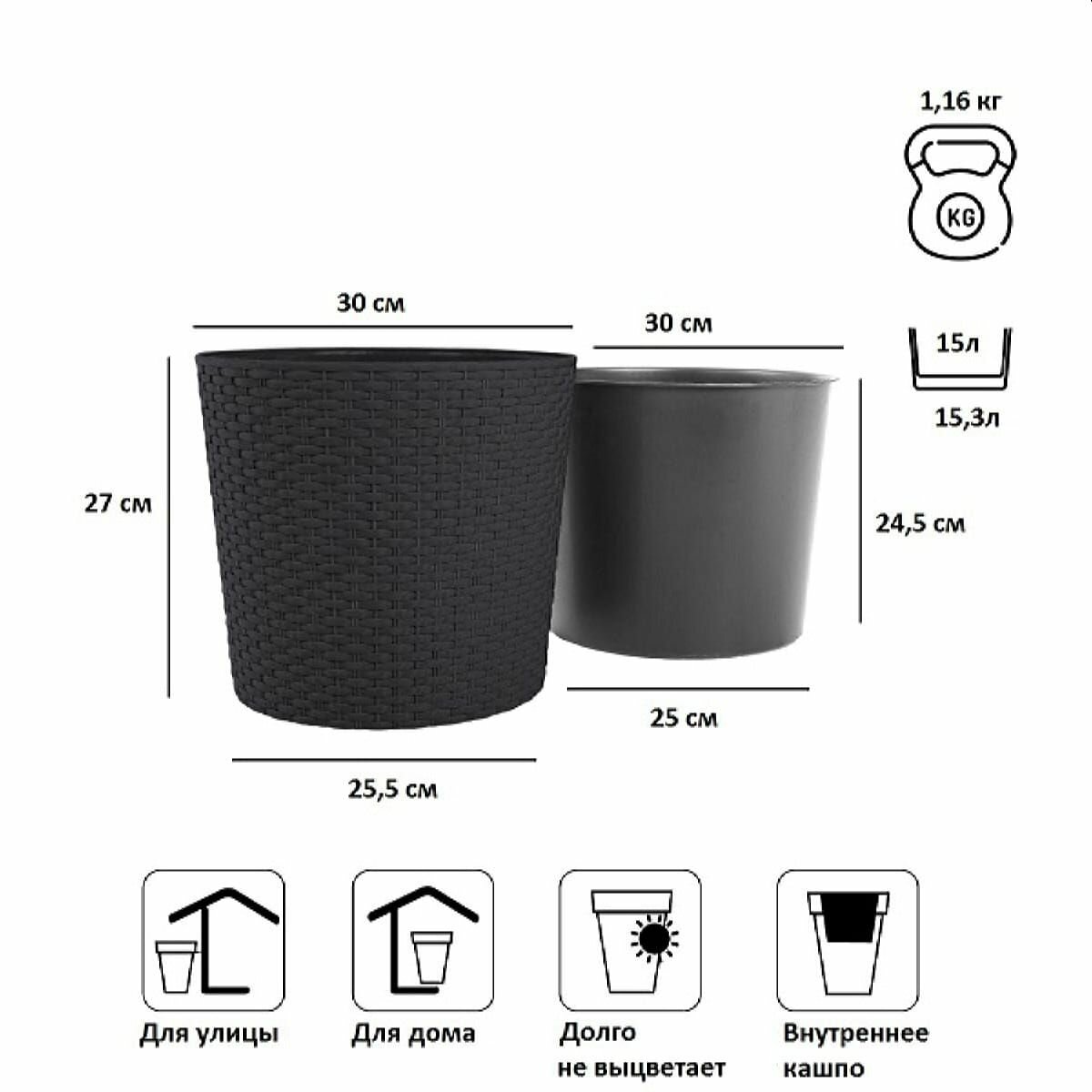 Кашпо для цветов напольное уличное и комнатное пластиковое из искусственного ротанга, горшок для фикуса суккулентов орхидеи высокий 15 и 15.3л, вазон для кактуса на балкон большой с декоративной подставкой информация: