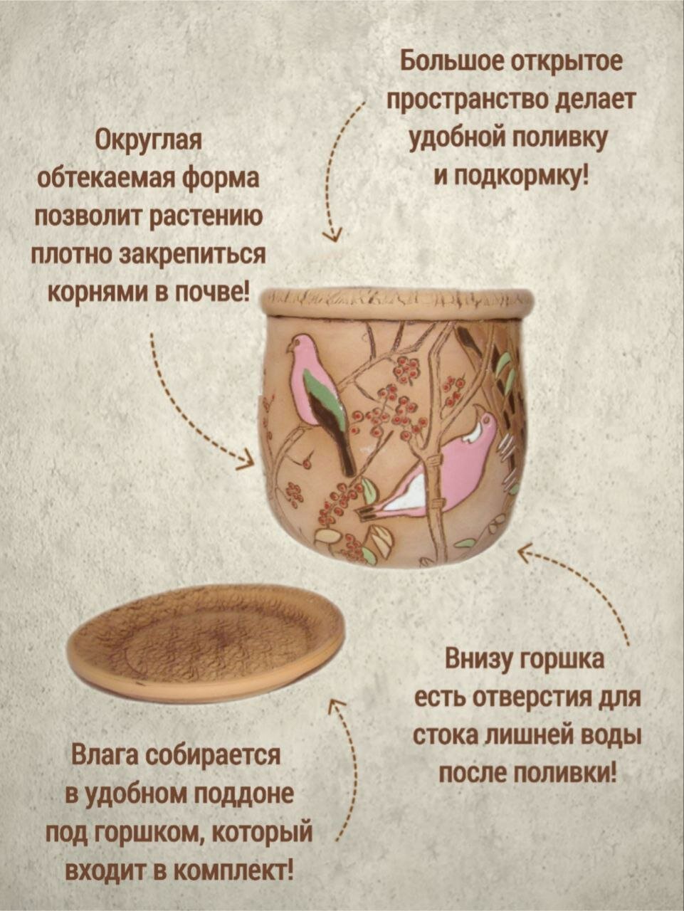 Авторский керамический горшок для цветов ручной работы, Птицы, 1,7л информация: