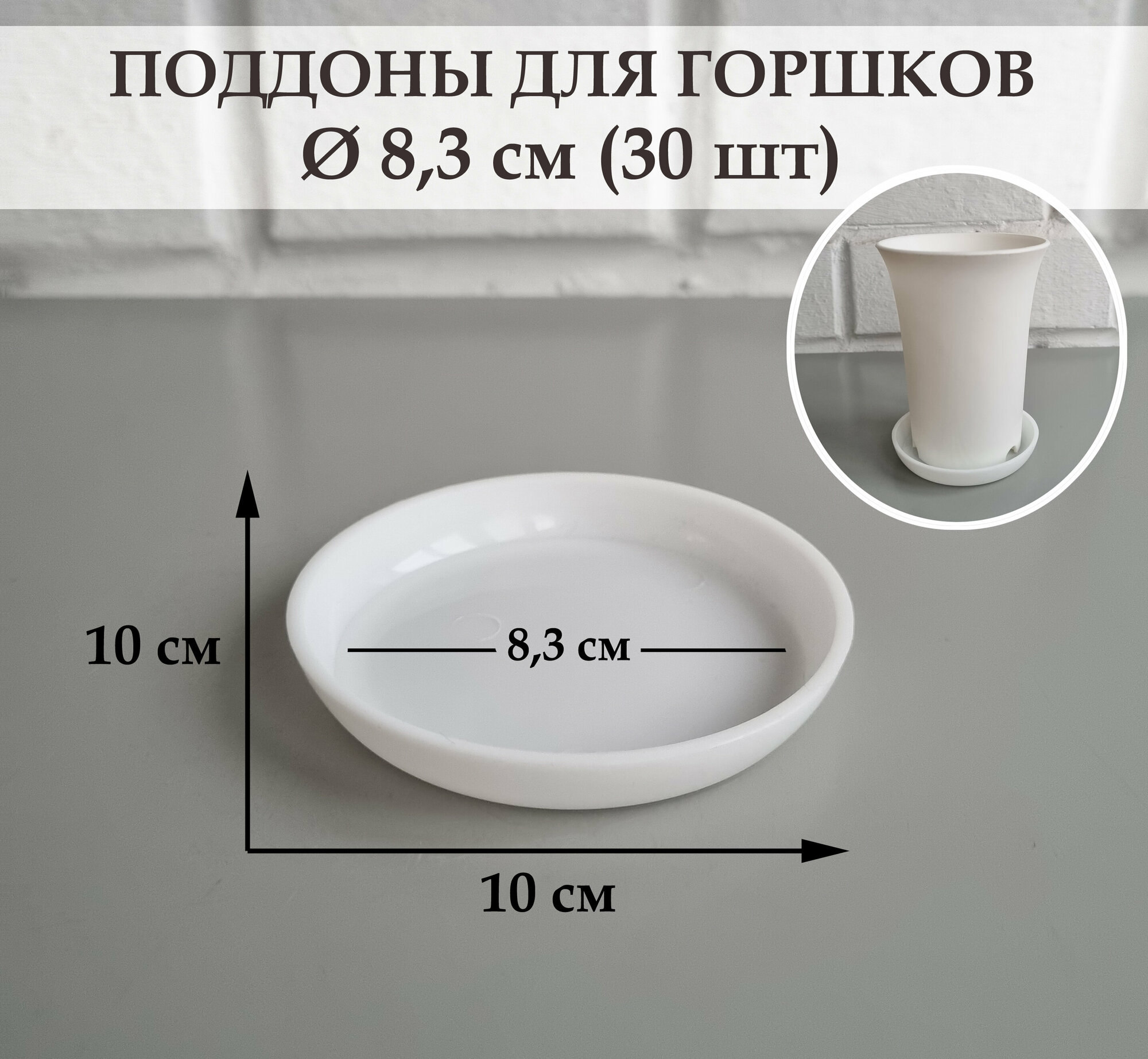 Круглые поддоны для горшков. Белые. Внешний диаметр 10 см, внутренний 8,3 см. Набор из 30-ти штук информация: