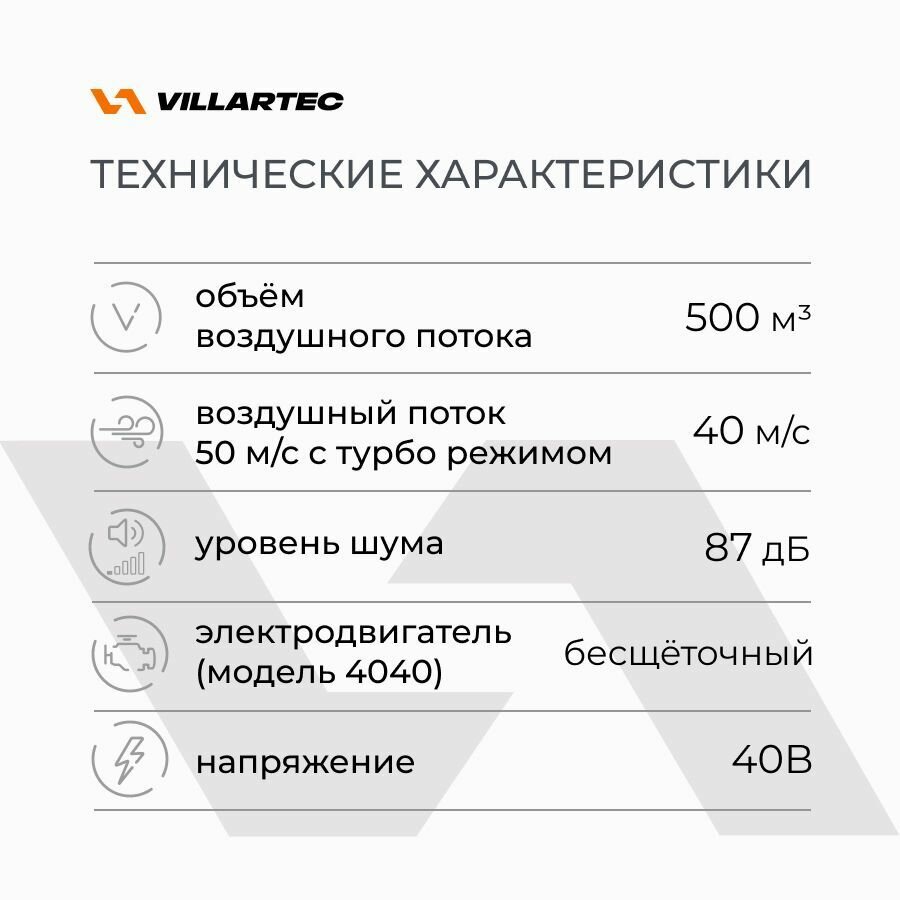 Воздуходувка аккумуляторная VILLARTEC BA40Set + аккумулятор и зарядное устройство информация: