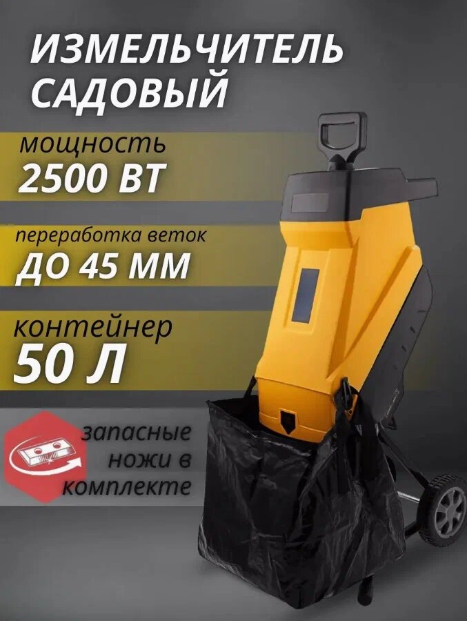 Измельчитель садовый электрический, 2500 Вт, диаметр веток 45 мм, 50 л информация: