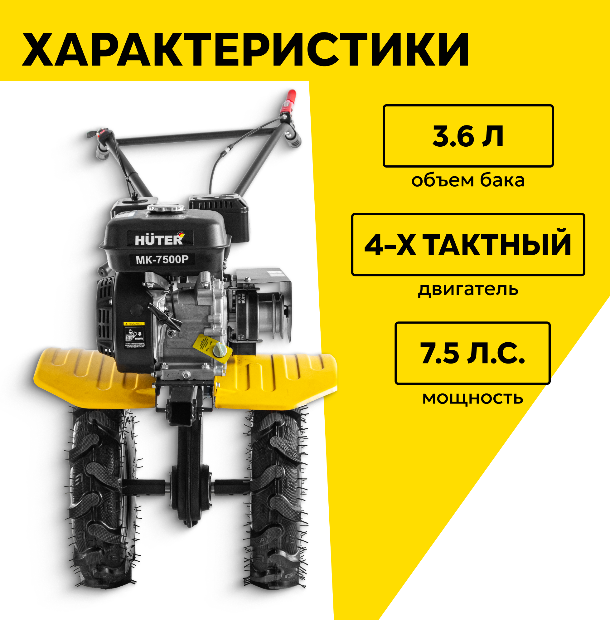 Сельскохозяйственная машина Huter МК-7500P, 7.5 л. с, четырехтактный, бензин, бак – 3.6 л, ширина – 100 см информация: