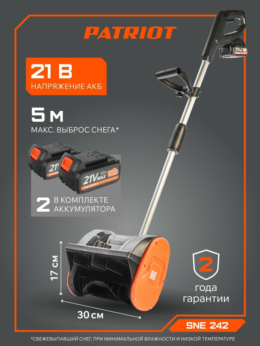 Снегоуборщик аккумуляторный ручной PATRIOT SNE 242 UES, 21В, ширина обработки 30 см, 2 АКБ и ЗУ в комплекте информация: