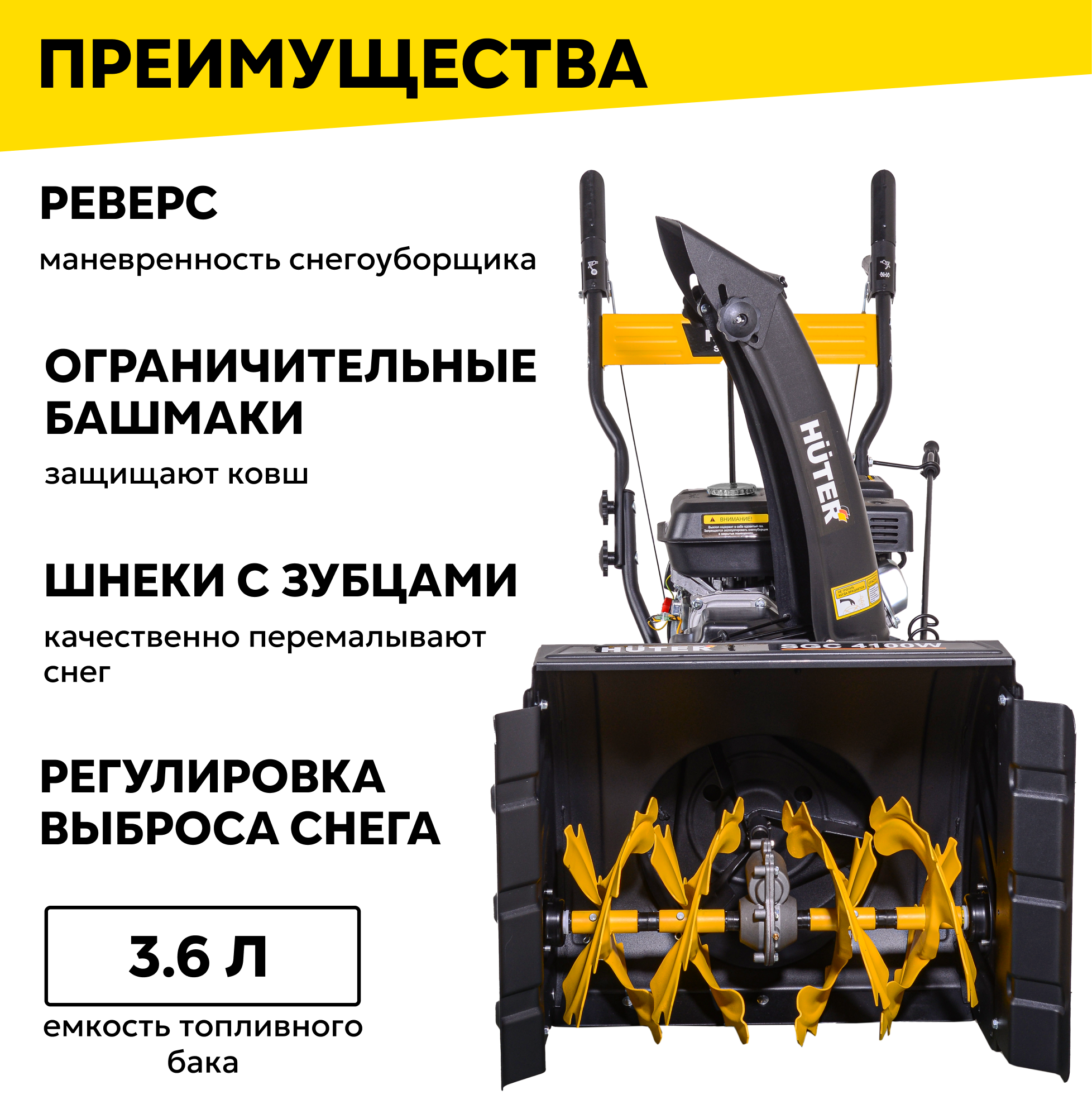 Снегоуборщик Huter SGC 4100W, 7 л. с, ковш - 68 см x 54 см,5 вперед / 2 назад информация: