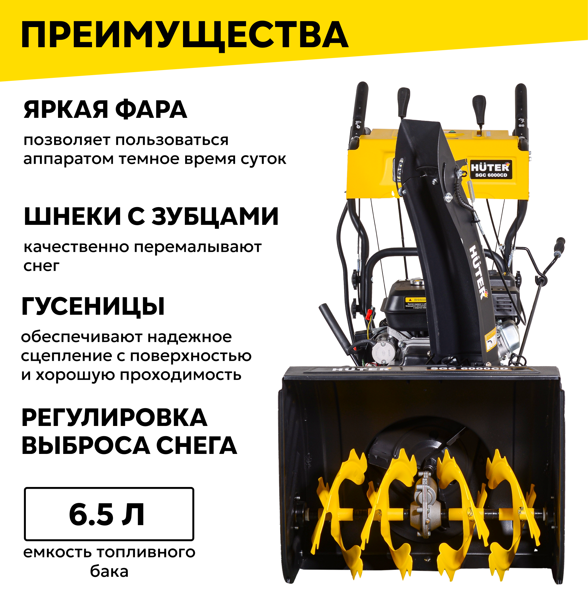 Снегоуборщик HUTER SGC 6000CD, 8 л. с. 62х54см, 6 вперед/2 назад, электростартер от 220 В информация: