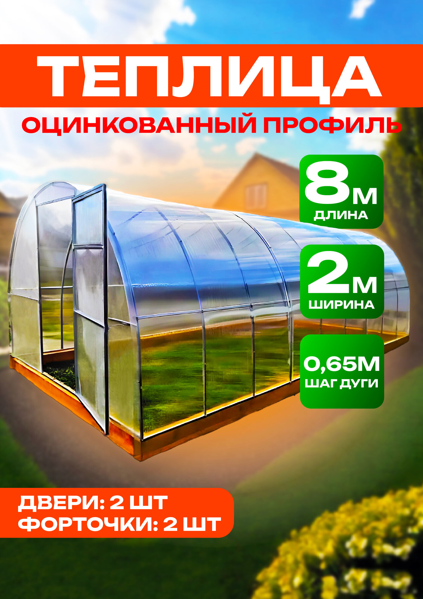 Теплица арочная с поликарбонатом, дуги 20 на 20. 8х2х2.02 с шагом 65 см информация: