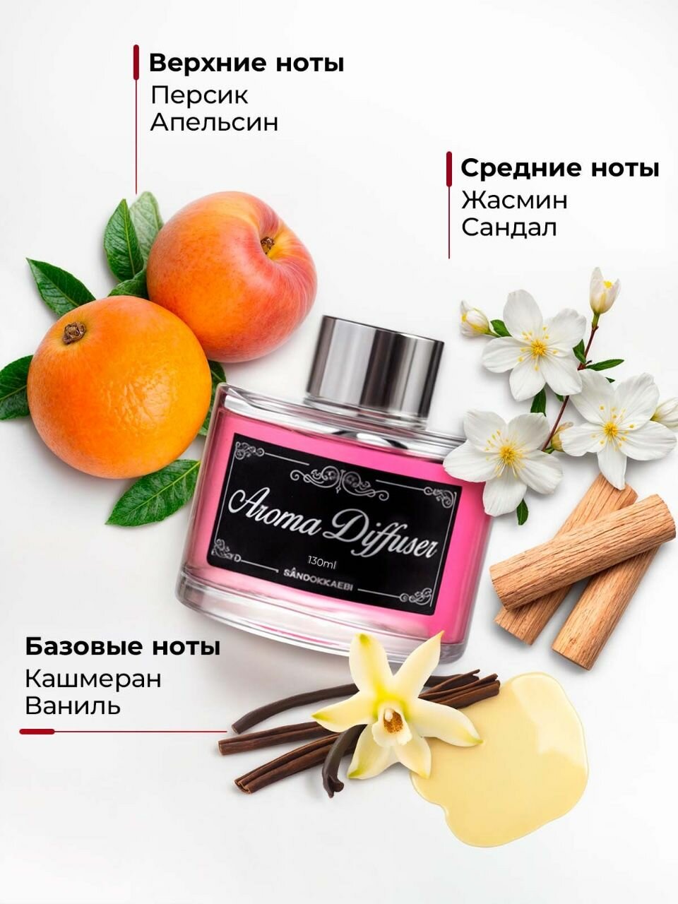 Ароматизатор диффузор для дома с палочками Sandokkaebi с фруктовым ароматом сладкого персика в стеклянном флаконе, 130 мл информация: