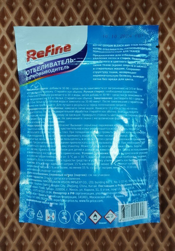 Характиристики этого товара не найдены!Отзывы на Отбеливатель-пятновыводитель Refine с активным кислородом без хлора, 300гр./ 1шт.