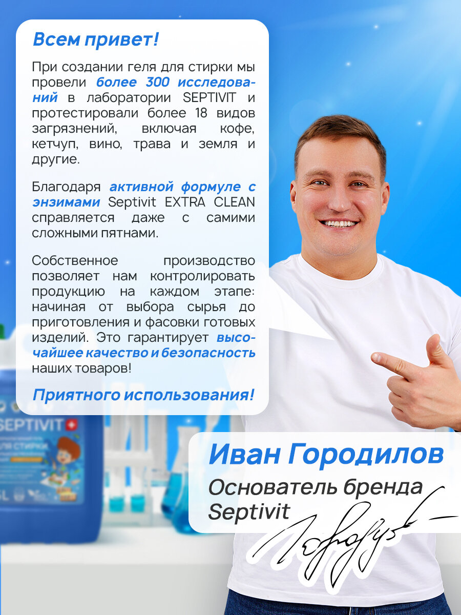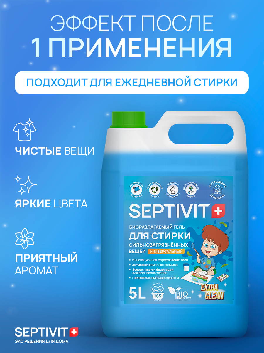 Отзывы на Гель для стирки Septivit Extra Clean, для сильнозагрязненных тканей, универсальный, с энзимами, канистра, 5 л