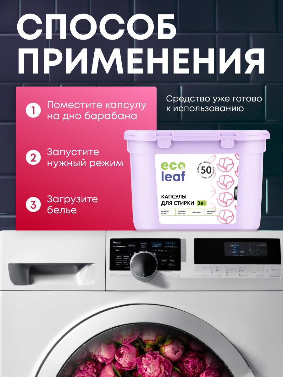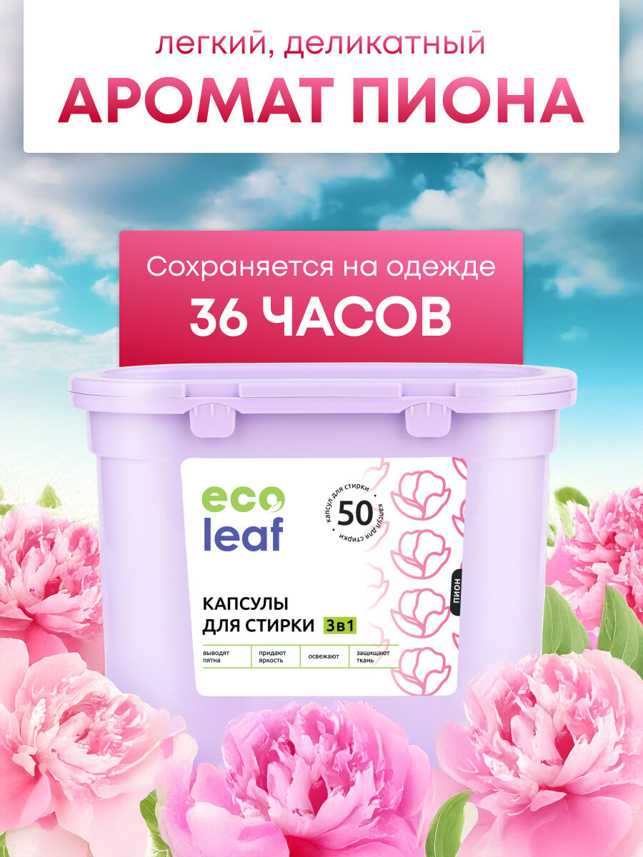Капсулы для стирки EcoLeaf "Пион 3в1", антибактериальный эффект, 50 шт информация: