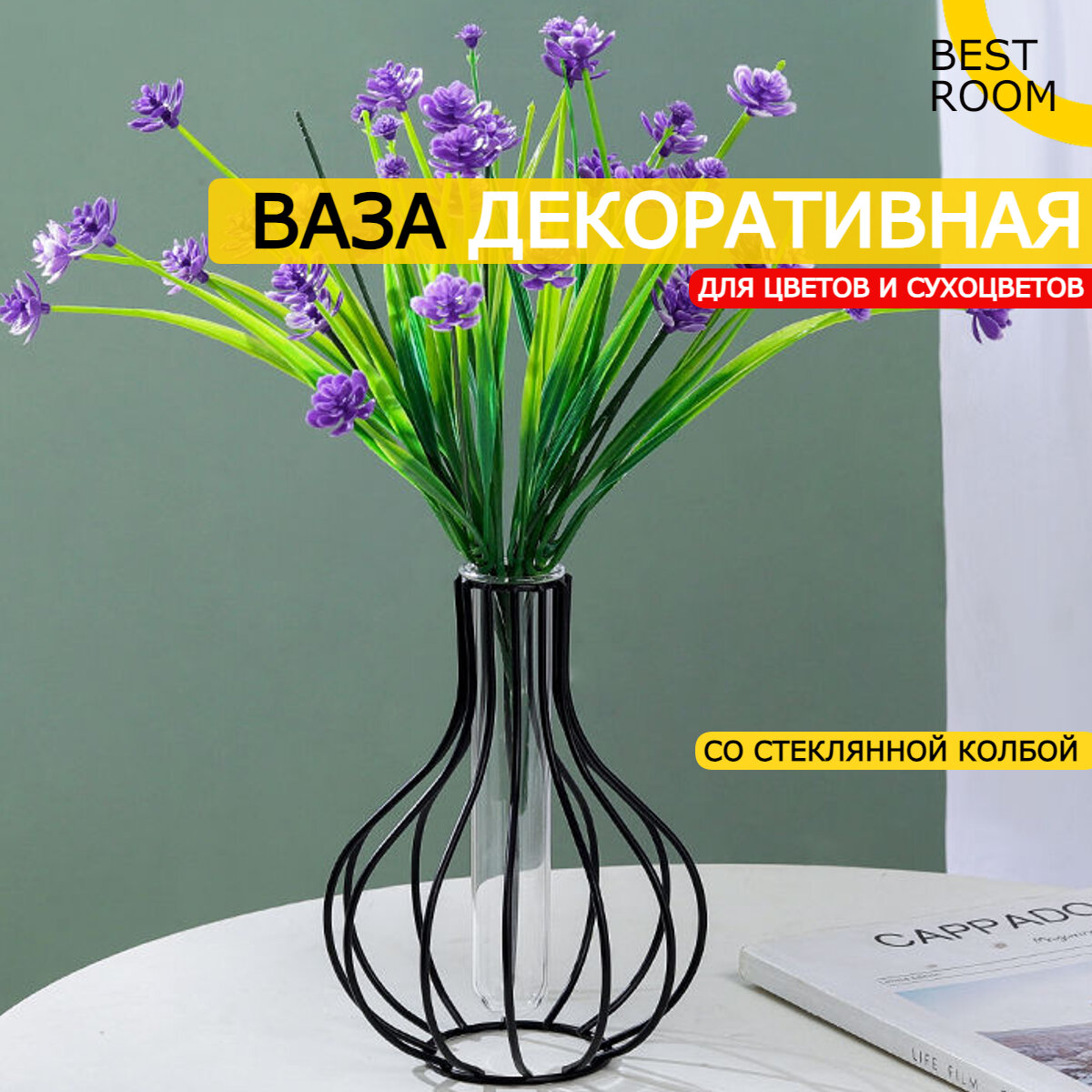 10 цен на Ваза для цветов сухоцветов Best Room, металл / стекло (Черная)